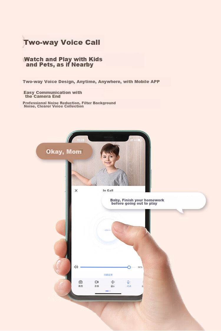 **Two-Way Audio:** Allows easy communication between the camera and the smartphone app, featuring professional noise reduction for clear voice collection.