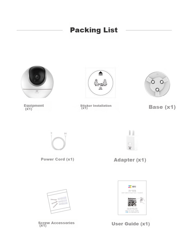**Package Contents:** Device (x1), installation sticker (x1), base (x1), power cord (x1), adapter (x1), mounting screws (x1), user guide (x1).