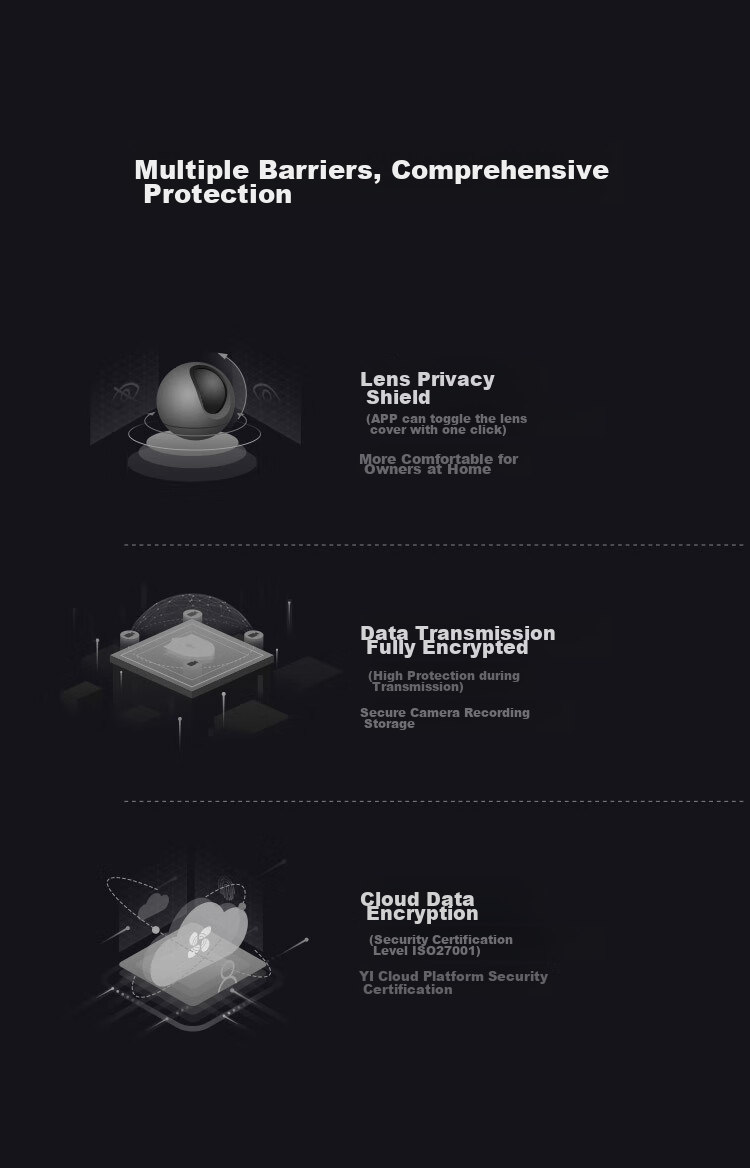 **Privacy Protection:** Features lens privacy cover control via the app, encrypted data transmission, and secure cloud storage with ISO 27001 certification.