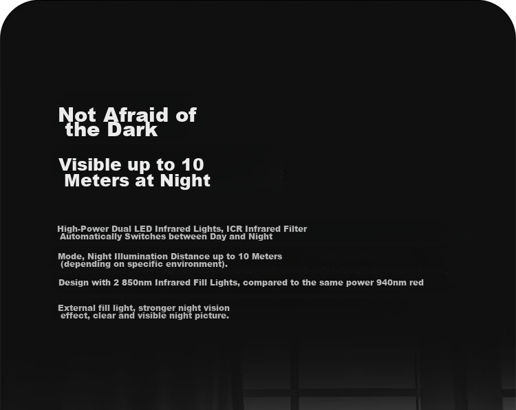 **Night Vision:** Up to 10 meters with high-power dual LED infrared lights and ICR infrared filter for automatic day/night mode switching