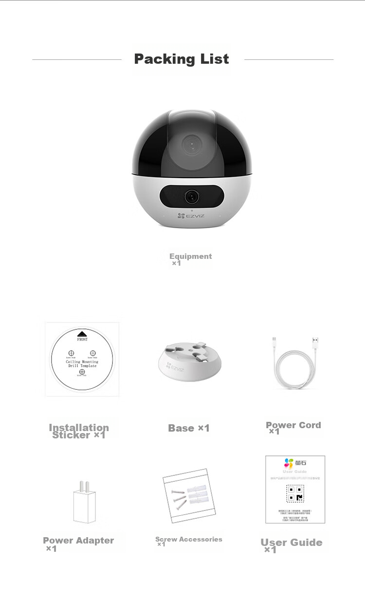 **Package Contents:** EZVIZ Camera, Installation Sticker, Base, Power Cable, User Guide, Power Adapter, Screw Accessories