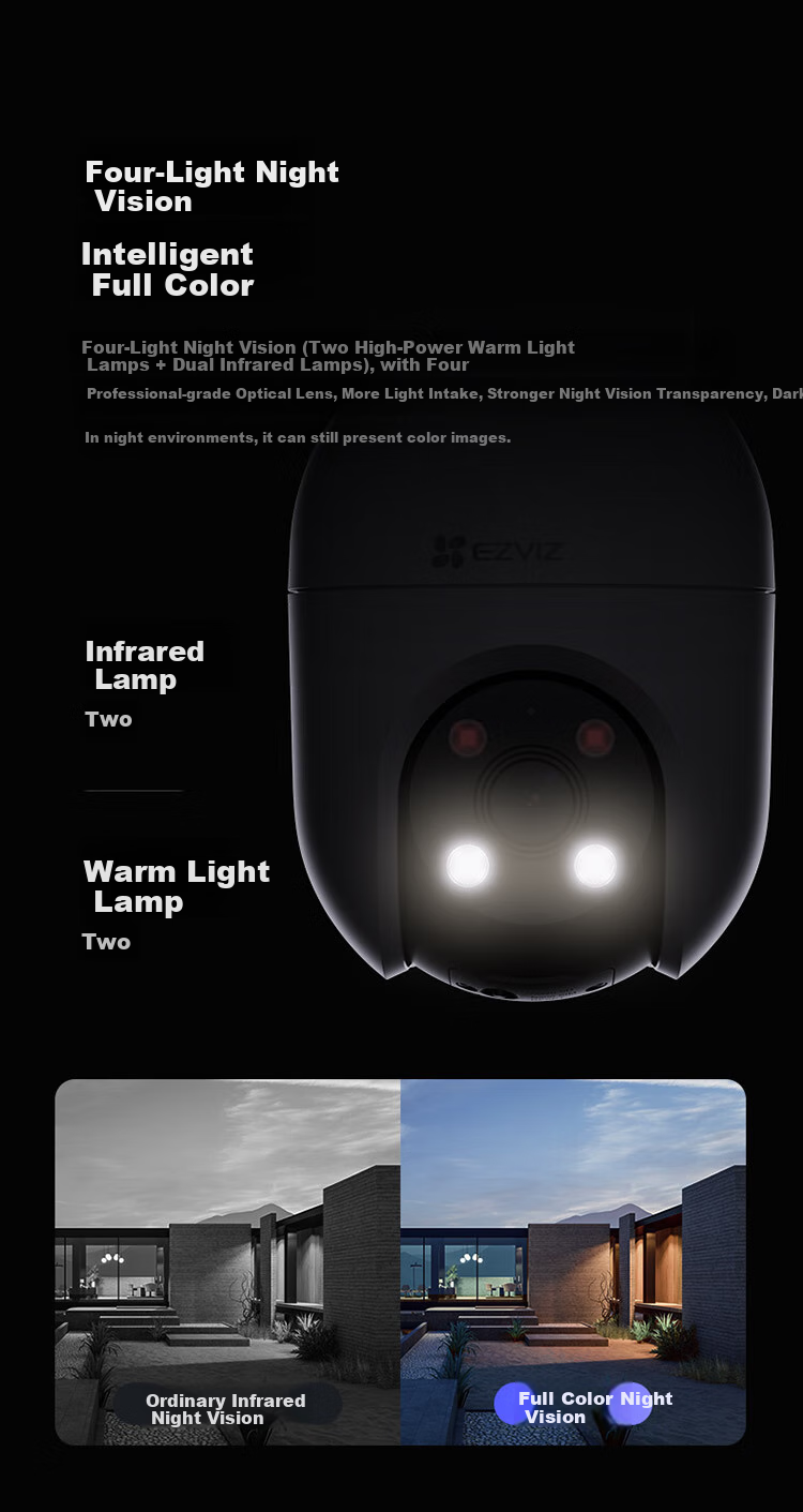 **Night Vision Modes:** Four LED night vision with warm lights for full-color night vision, two warm lights and two infrared lights for standard night vision