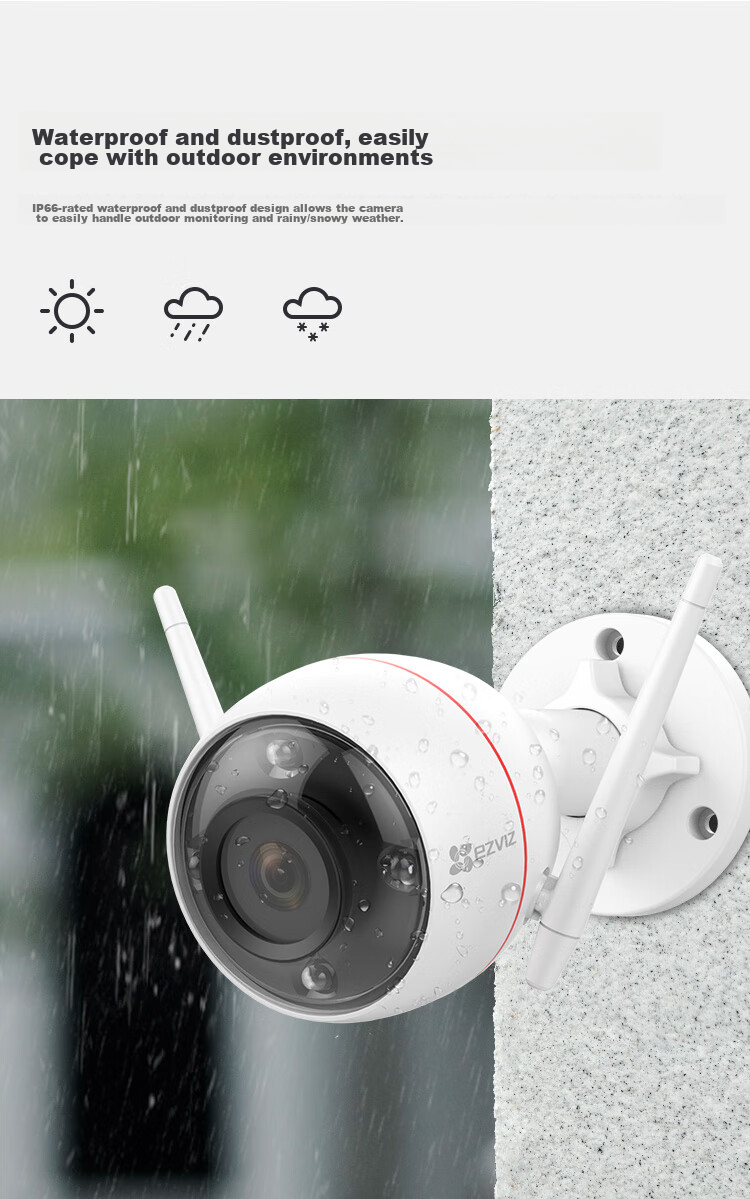 Features dual-antenna Wi-Fi, two-way voice intercom, and IP66 waterproof and dustproof rating.