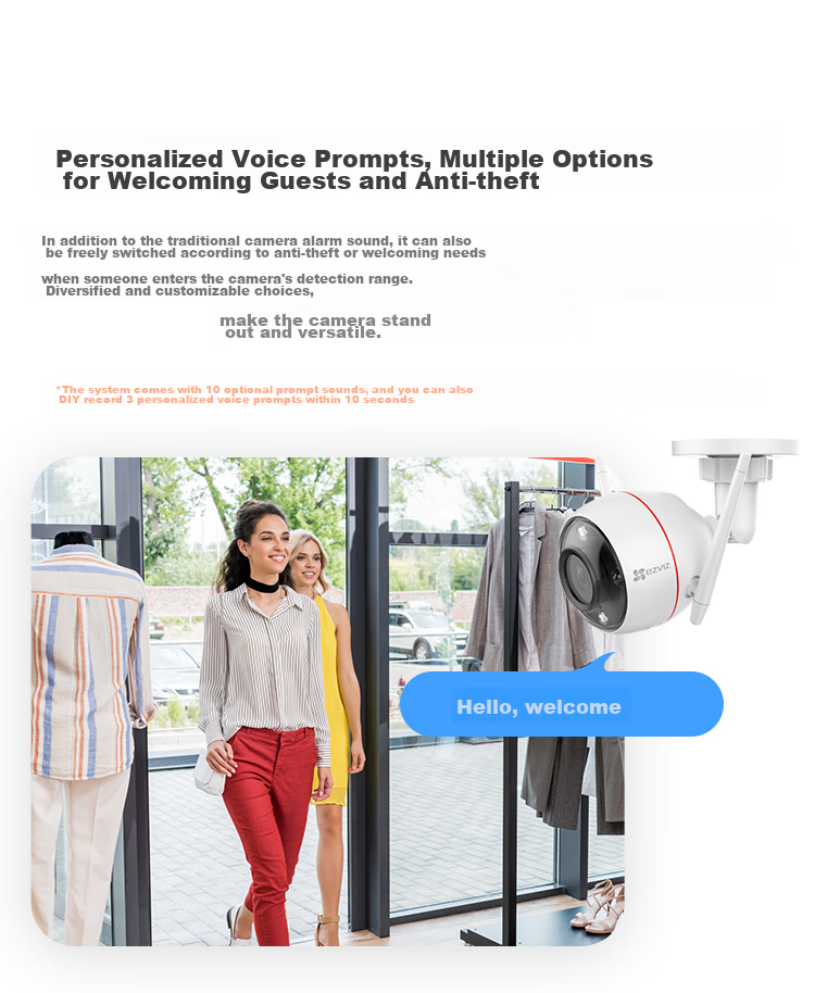 Personalized voice prompts and active defense feature to deter intruders.
