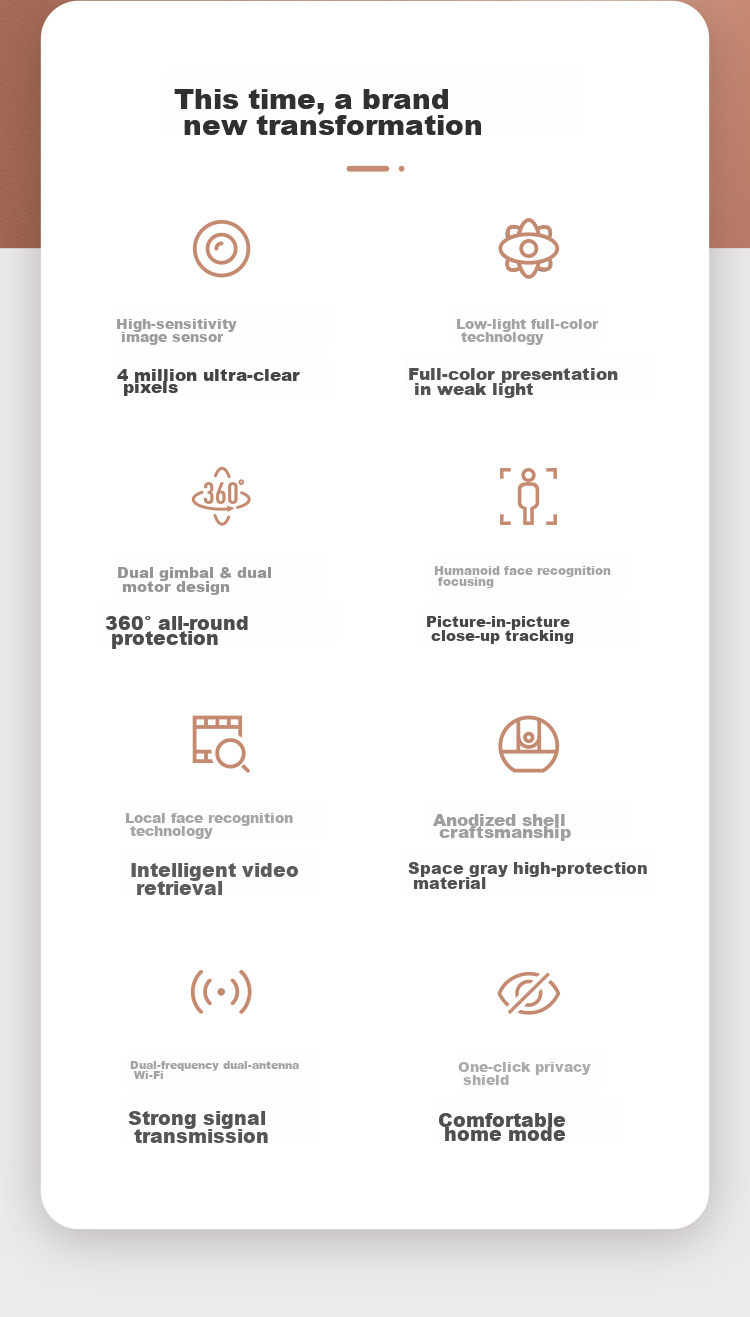 **Special Features:** Dual motor design, local face recognition, anodized aluminum shell, intelligent video retrieval, space gray high-protection material, dual-band Wi-Fi, one-click privacy mask