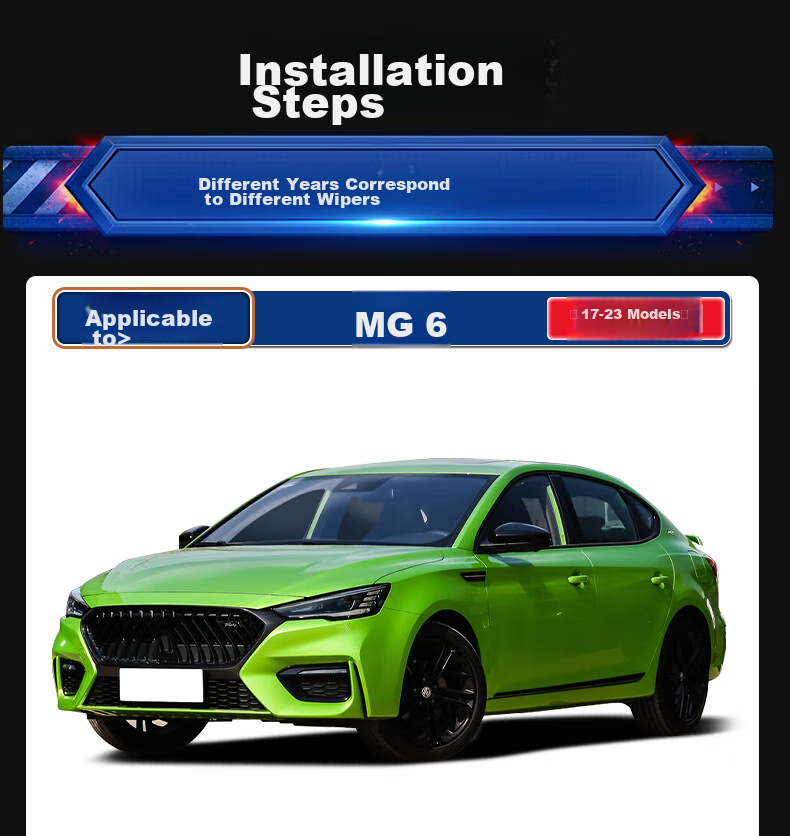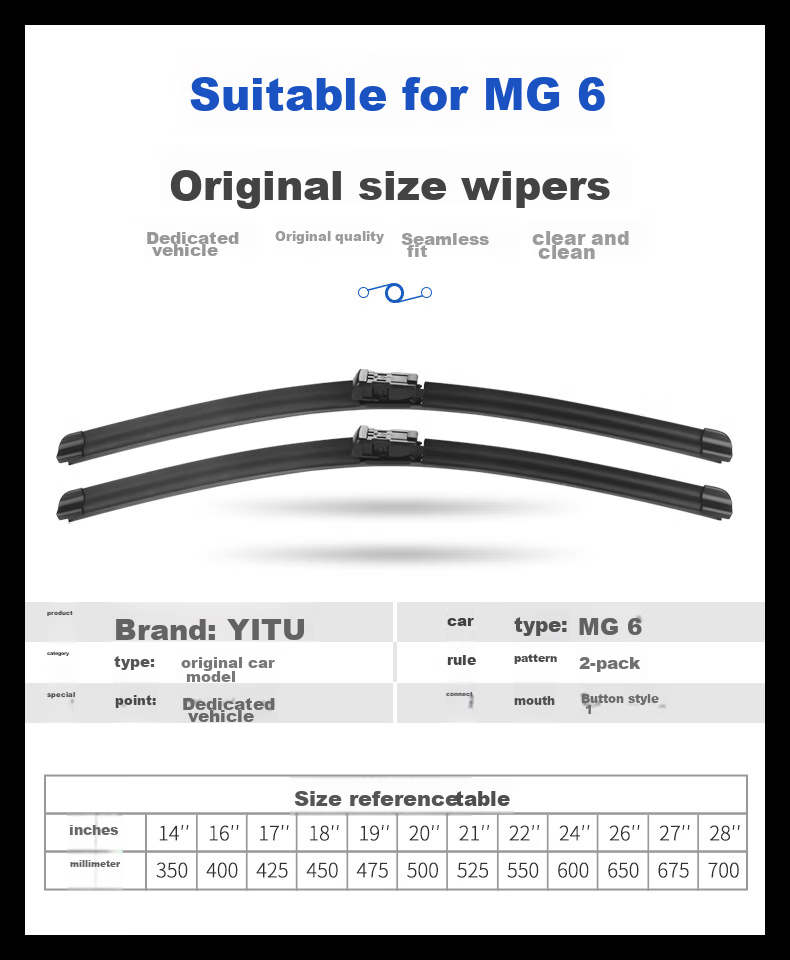 **Features:** Original size wipers for MG 6, tailored for specific car models. Boneless fit for clear and clean wiping.