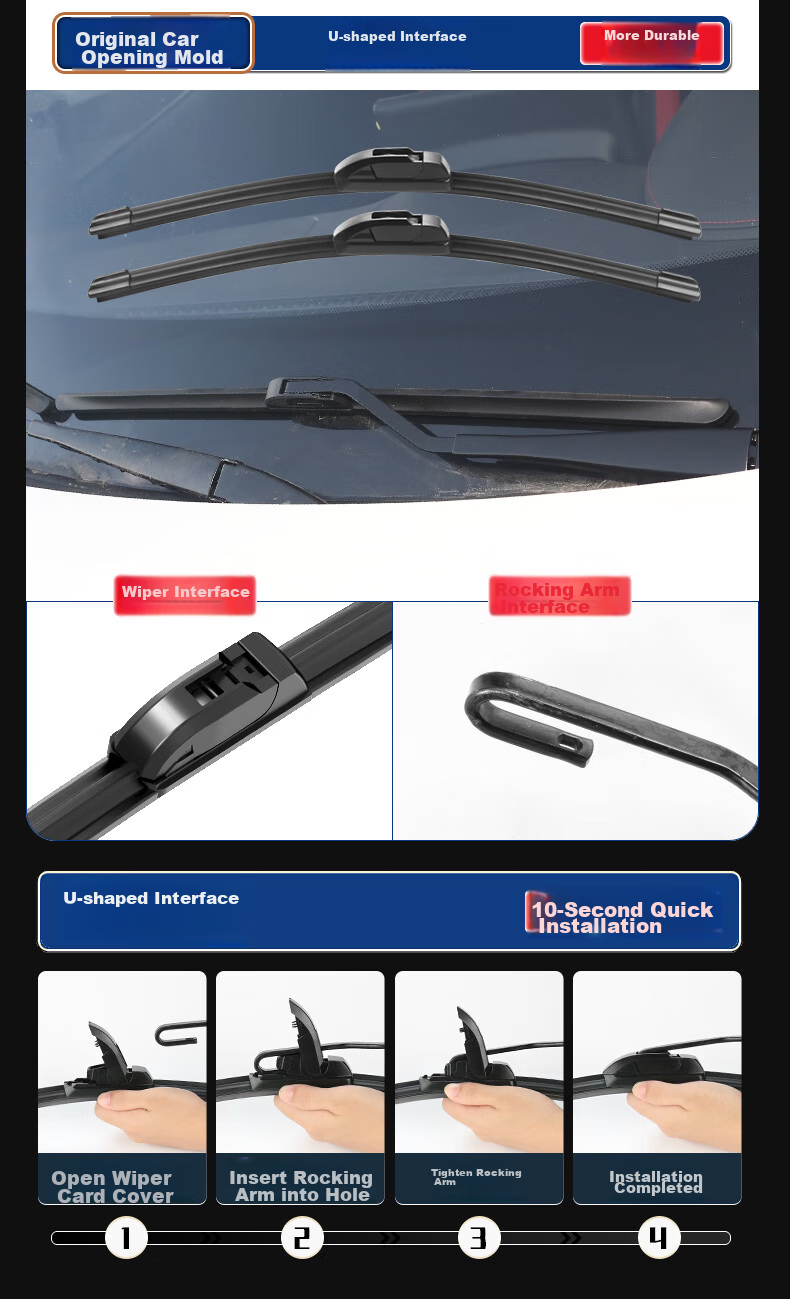 **Installation Steps:** Original car mold, U-shaped interface for durability. Wiper interface, rocker arm interface, U-shaped interface. Quick 10-second installation: open the wiper cover, insert the rocker arm into the hole, tighten the rocker arm to complete installation.