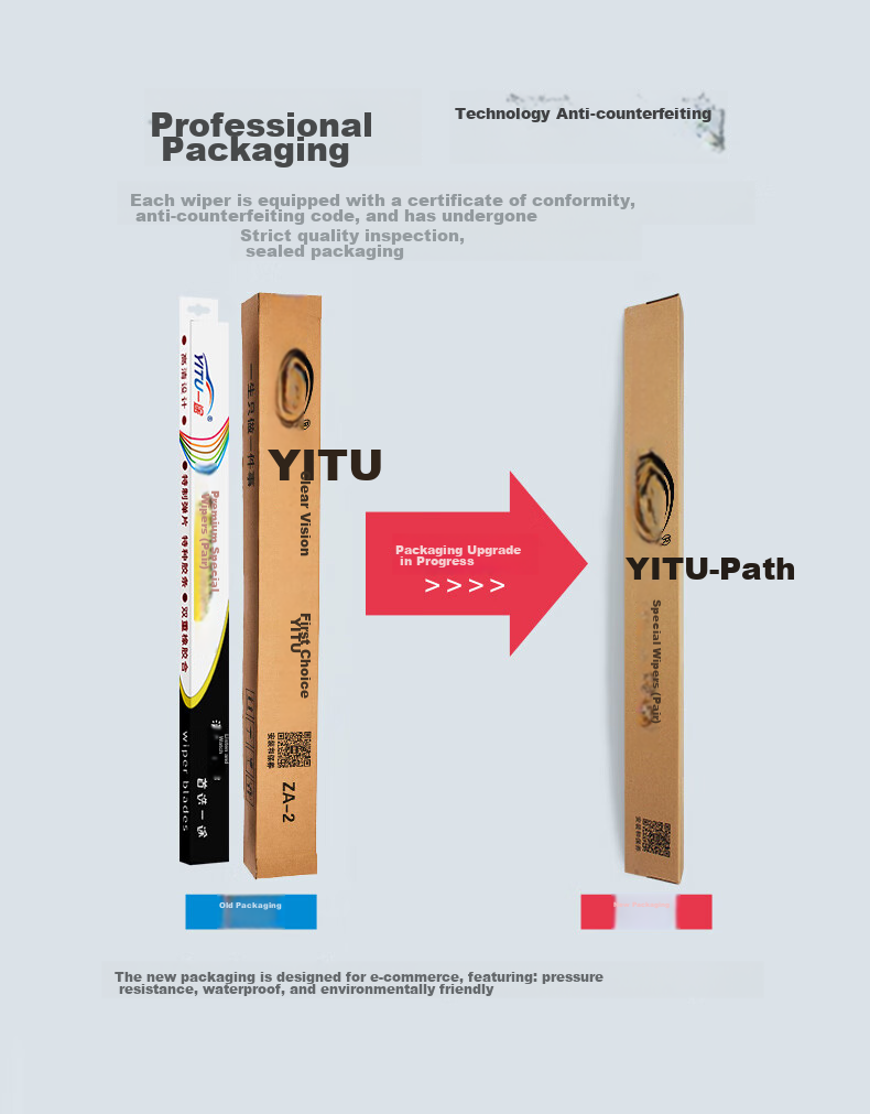 **Packaging:** Upgraded packaging for YITU wipers, VVVV special wipers, ZA-2, designed for e-commerce, featuring pressure resistance, waterproofing, and environmental protection.