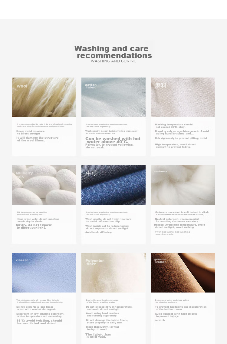 - Viscose, polyester, and genuine leather: Neutral detergent hand wash at max 35°C, avoid prolonged soaking, air dry, do not twist or wring