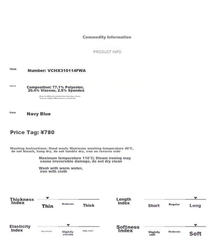 - Fabric: 77.1% polyester, 20.4% viscose, 2.5% spandex