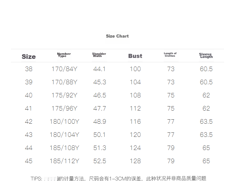 - Size 45: 185/112Y, Shoulder 52.5cm, Chest 128cm, Length 79cm, Sleeve Length 65cm
