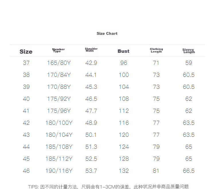 (Note: Due to production batches and fabric color differences, material composition may vary. Please refer to the size chart for chest circumference, shoulder width, sleeve length, etc., and choose according to your usual wearing habits. If the size is not suitable, please consult customer service for exchange.)