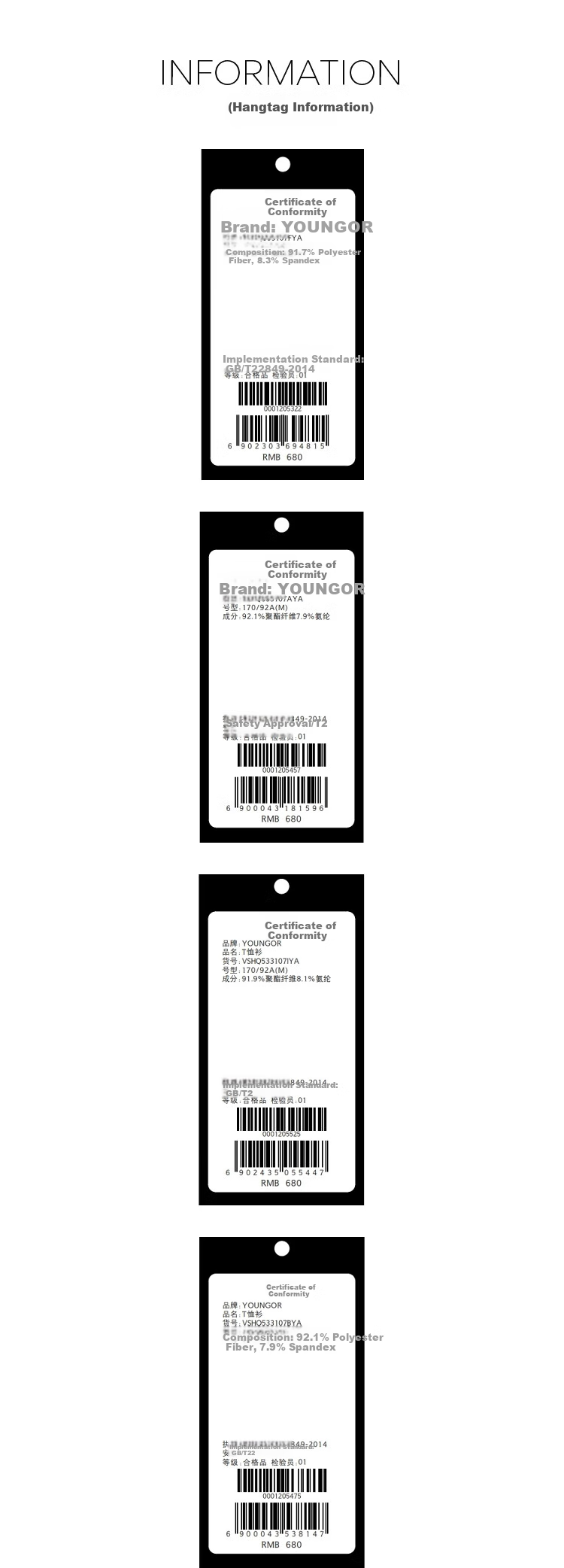 Information: Hangtag details - Brand: YOUNGOR, Composition: 91.7% polyester fiber, 8.3% spandex, Executive Standard: GB/T22849-2014. Hangtag details - Brand: YOUNGOR, Approval Number: T2, Executive Standard: GB/T2, Composition: 92.1% polyester fiber, 7.9% spandex, Executive Standard: GB/T22.