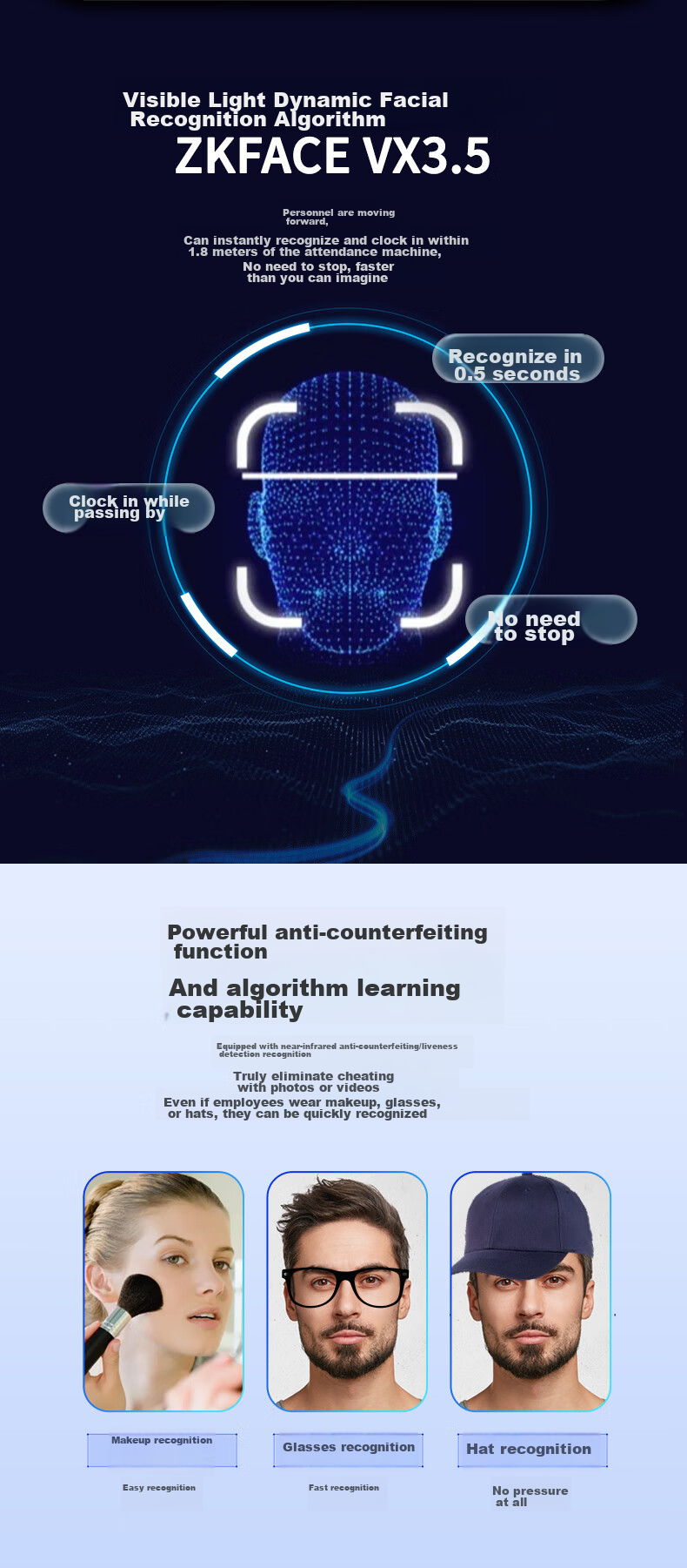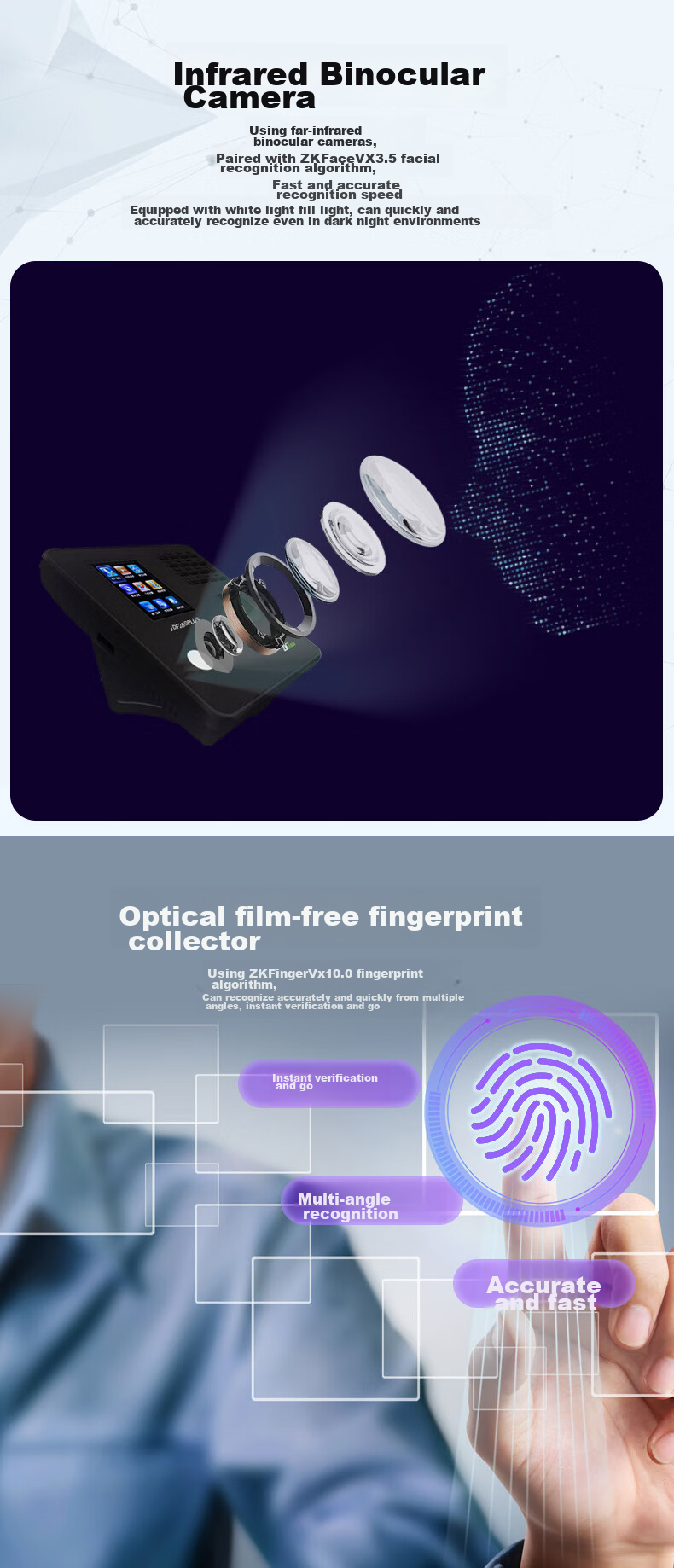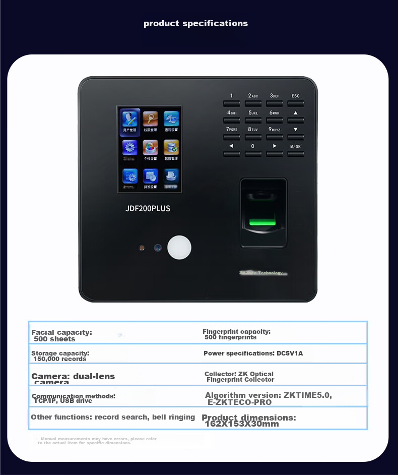 Additional Features: Infrared dual-camera for low-light conditions, intelligent supplementary lighting, multiple verification methods, including 11 combinations