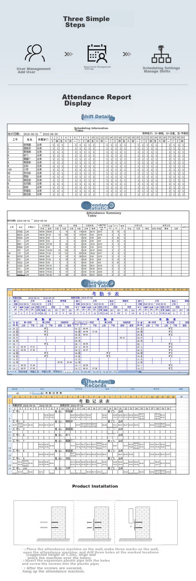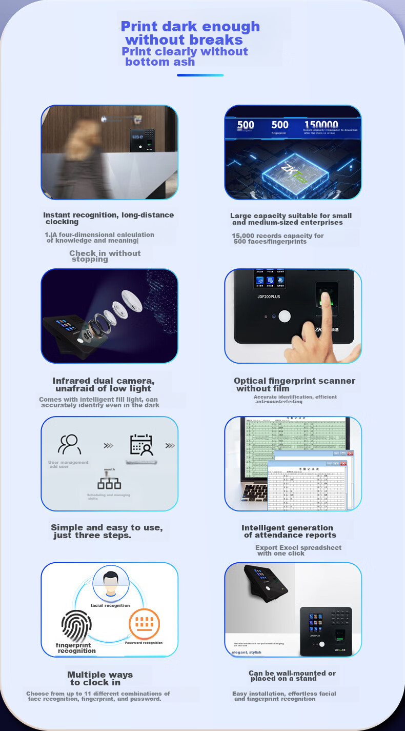 Features: Dynamic face/fingerprint recognition, simple three-step operation, large capacity, self-service report generation