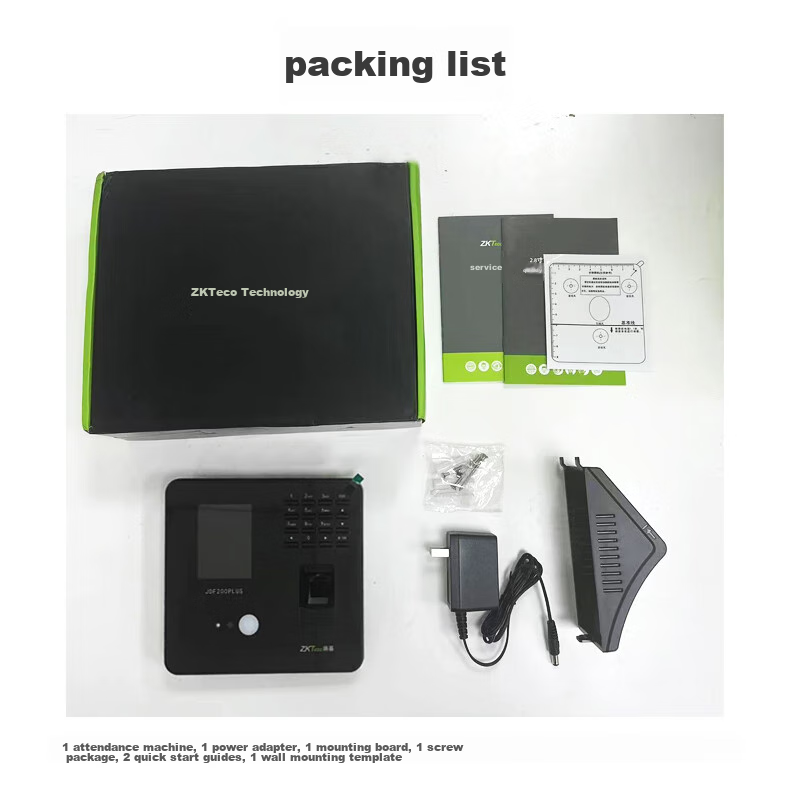 Package Contents: Attendance machine, power adapter, mounting plate, screws, quick start guide, wall mounting template