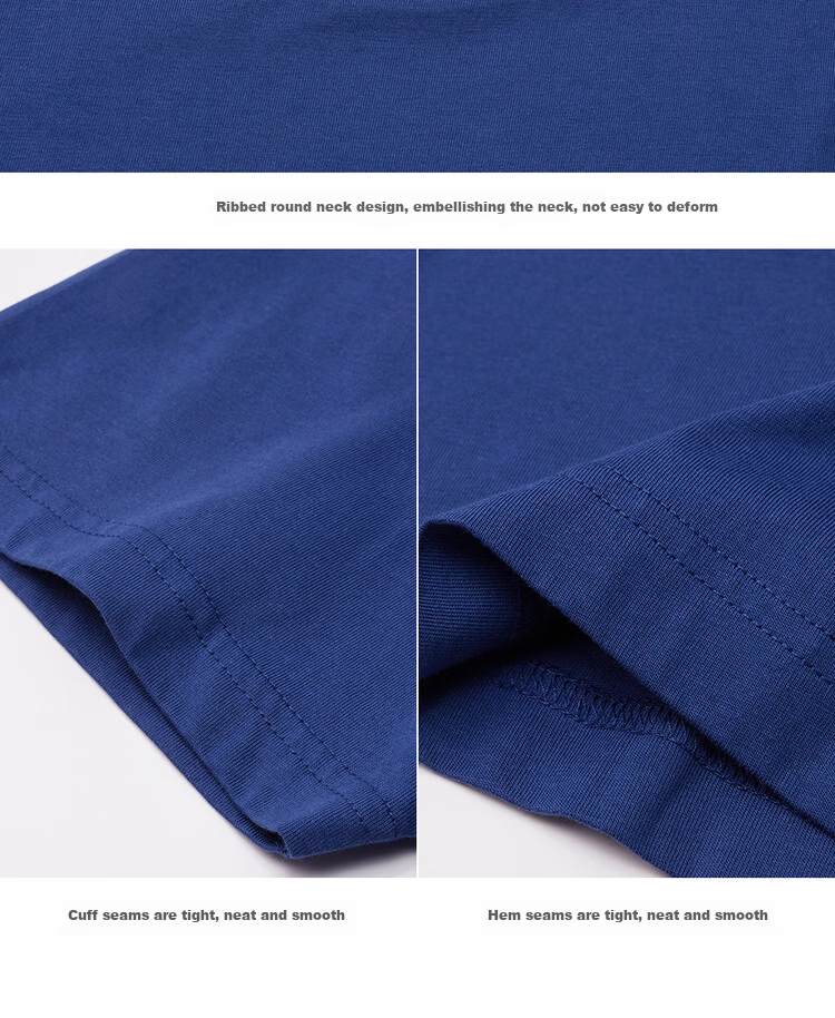 Design Details: Ribbed round neckline, tight stitching on cuffs and hem for durability and neatness