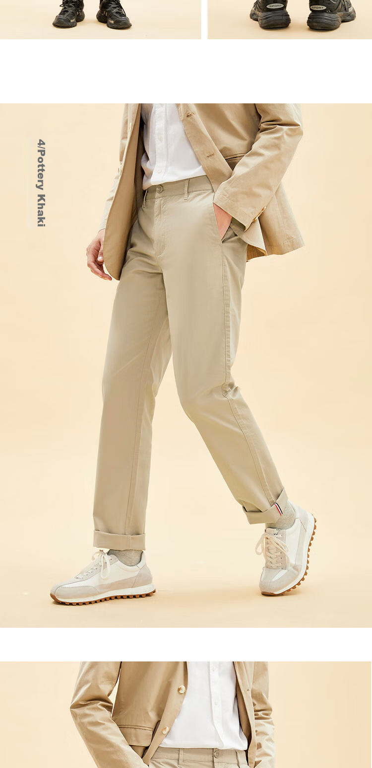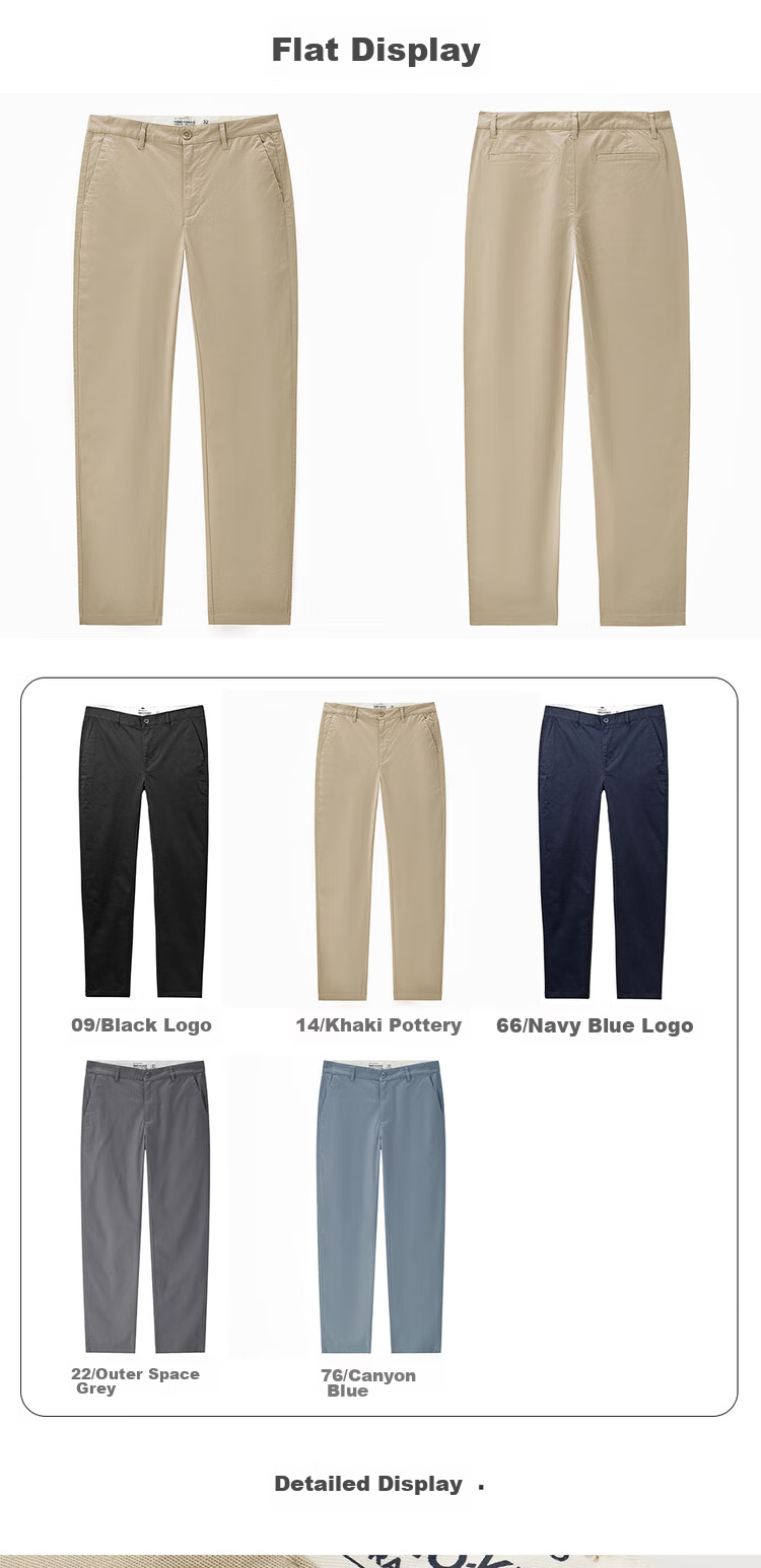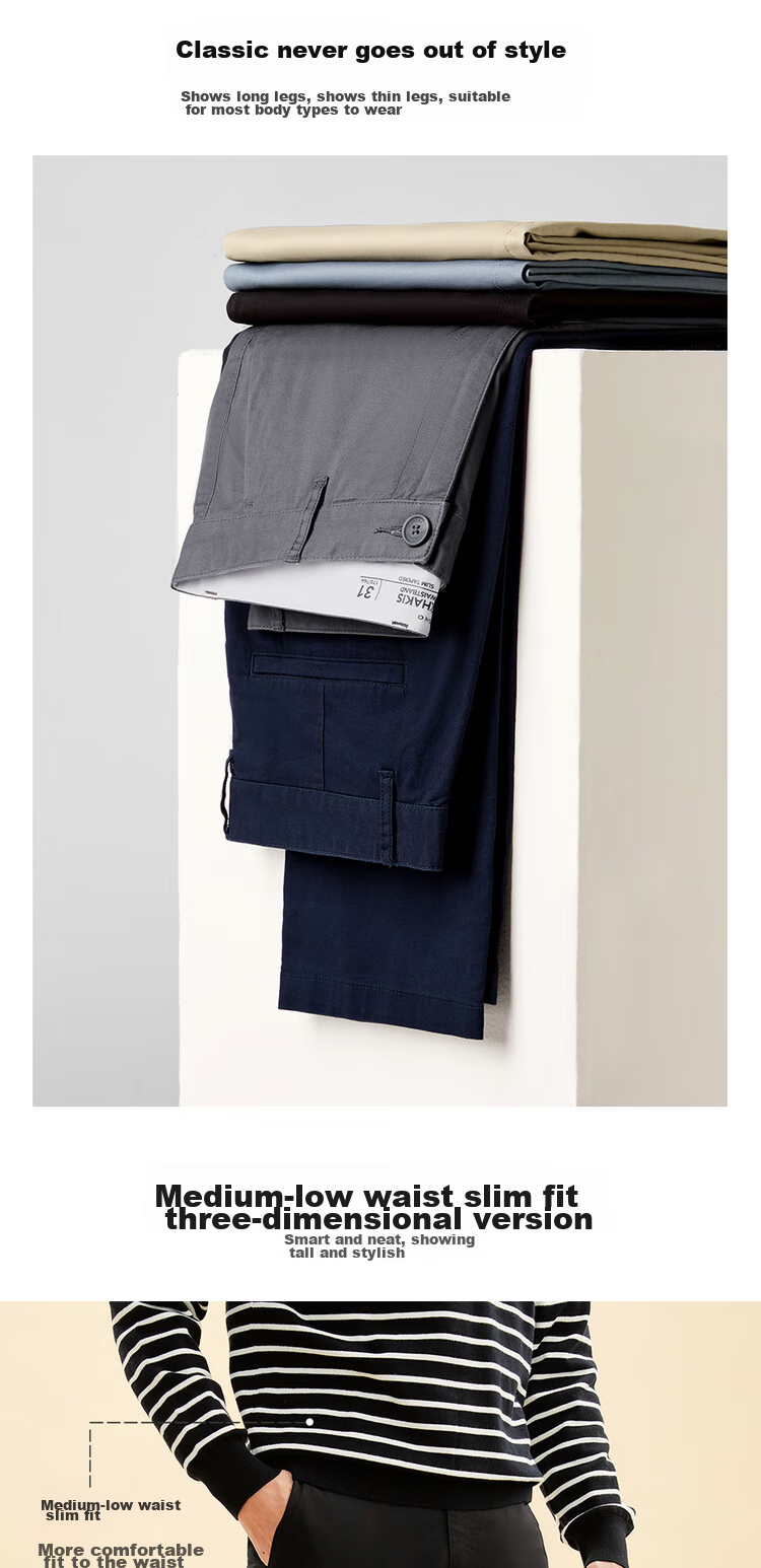 **Features:** Low-rise slim fit casual pants with stretch, classic design, suitable for various body types, comfortable fit, elastic waistband, smooth zipper closure, side pockets, back welt pockets, straight leg cut with stretch, available in various colors