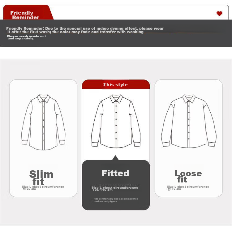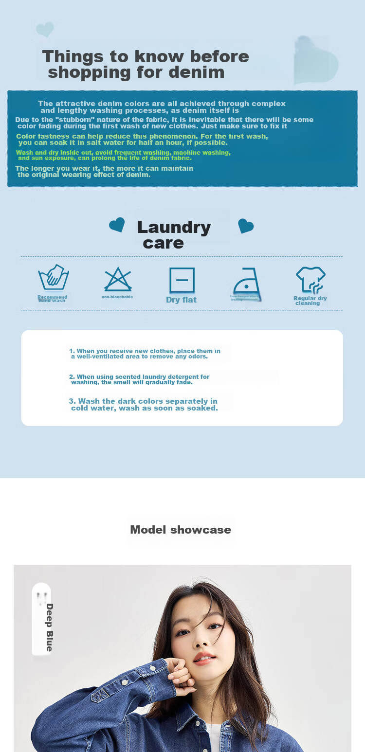**Fabric Care:** Wash separately, avoid frequent washing, machine washing, and direct sunlight exposure. Initial wash may have color bleeding, soak in saltwater for half an hour before washing. Reverse wash and dry to maintain denim color and quality.