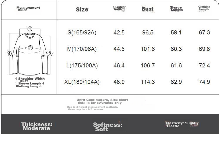 **Measurements:** Size, shoulder width, chest circumference, sleeve length, length