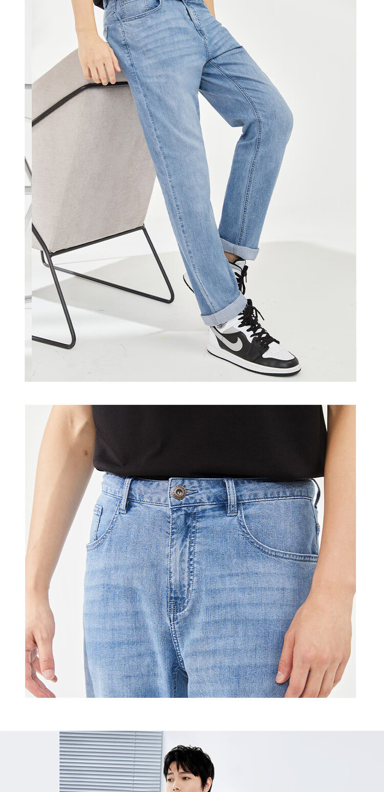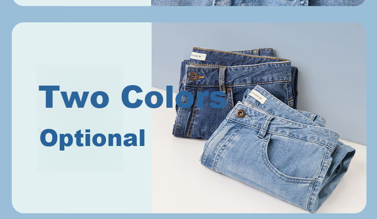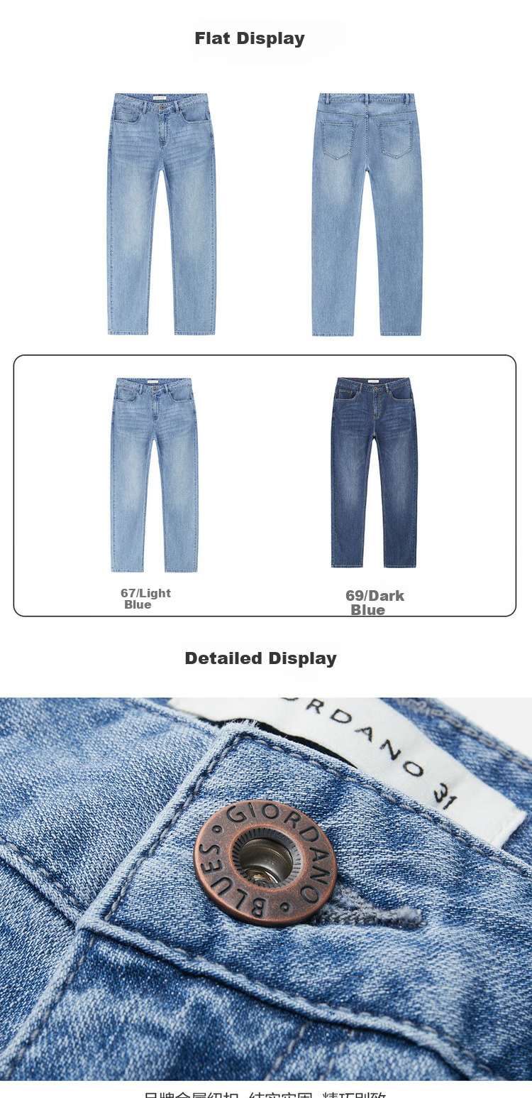 **Detail Display:** Features brand's metal button, classic five-pocket design, neat stitching, and meticulous workmanship