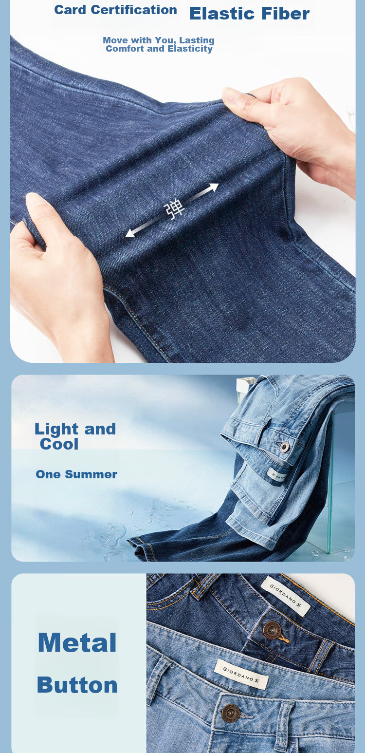 **Features:** Cat whisker hand rubbing, slim straight fit, thin fabric, elastic fiber for lasting comfort and shape retention, cool and lightweight, metal button closure, available in two colors.