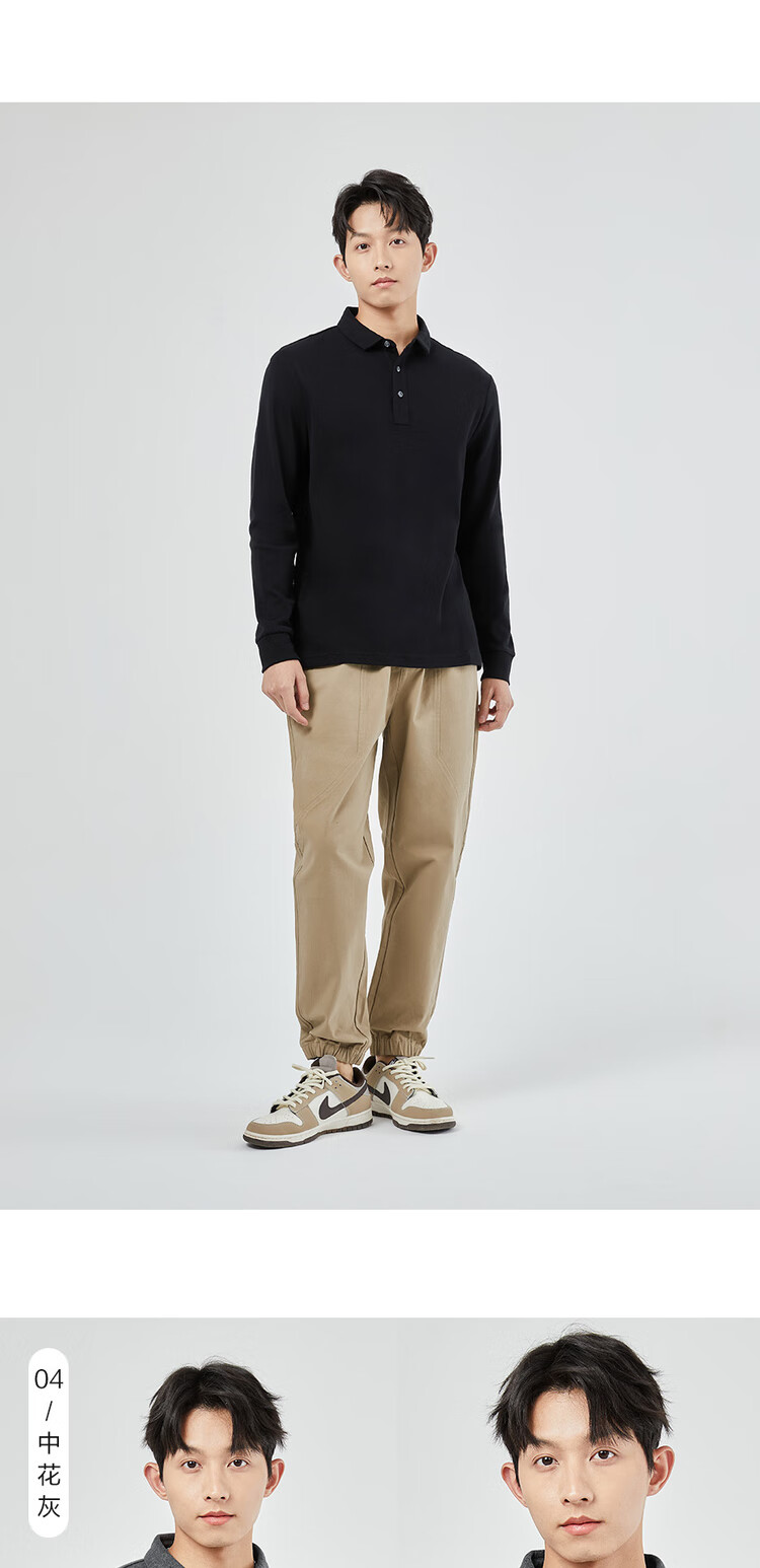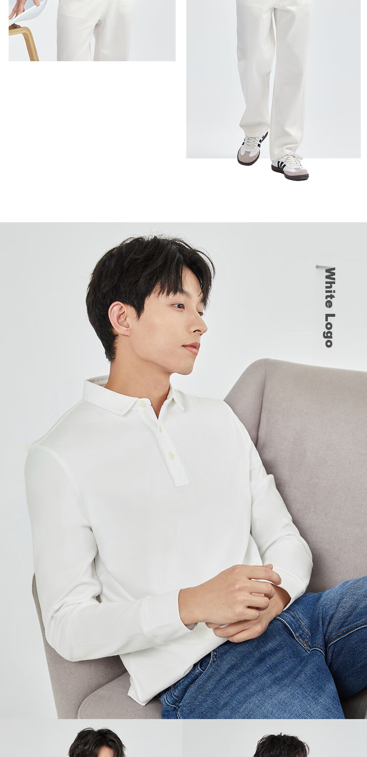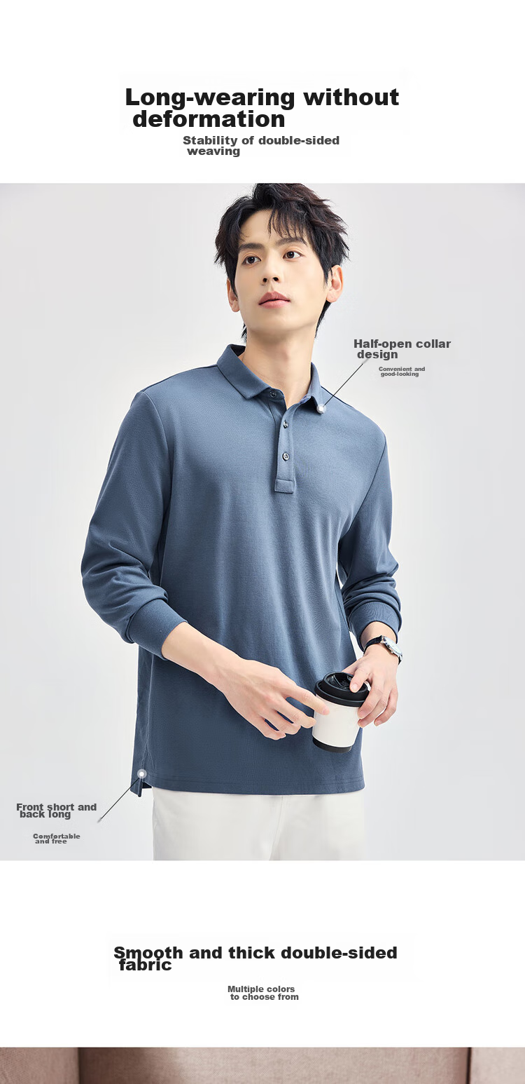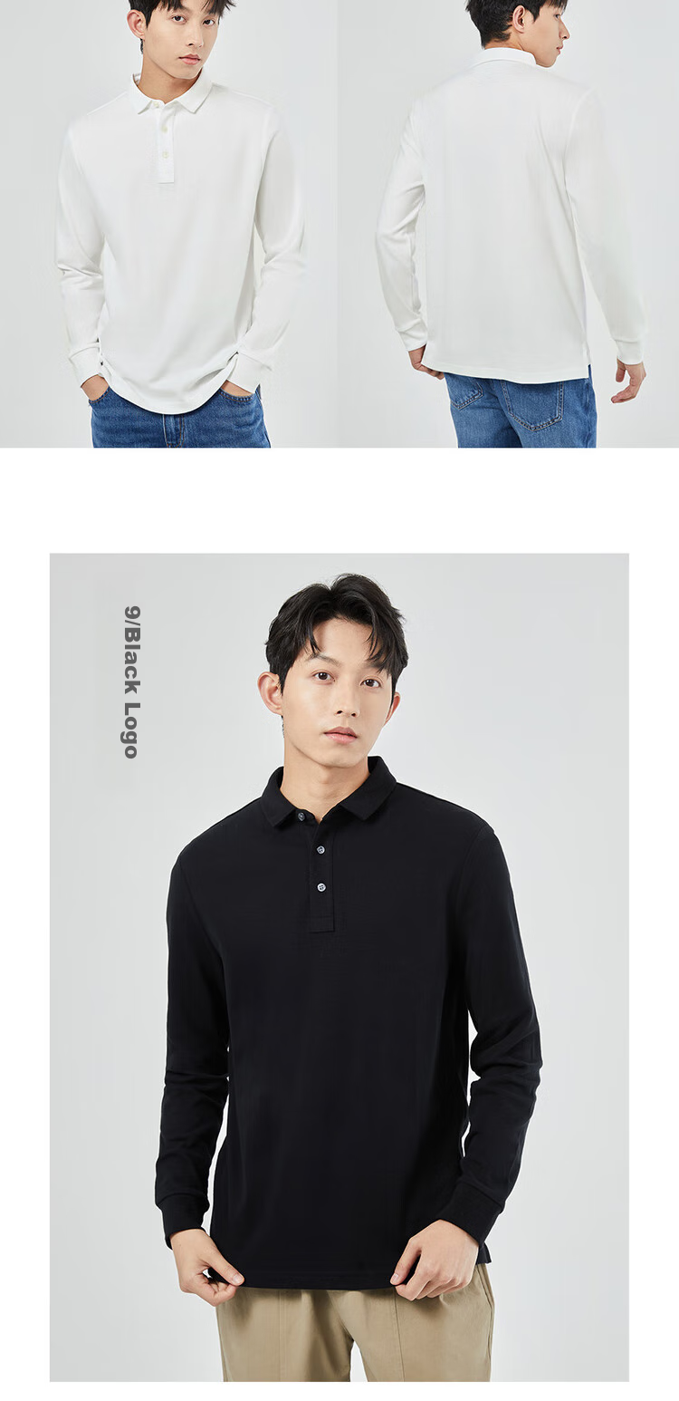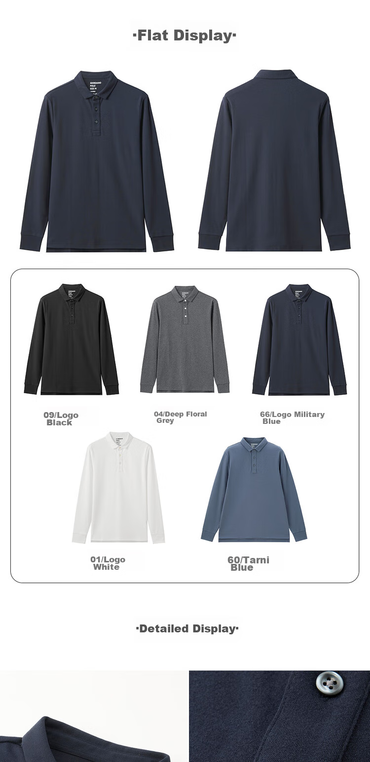 **Details:** Classic polo collar with four-button placket, matte finish, ribbed cuffs, split hem