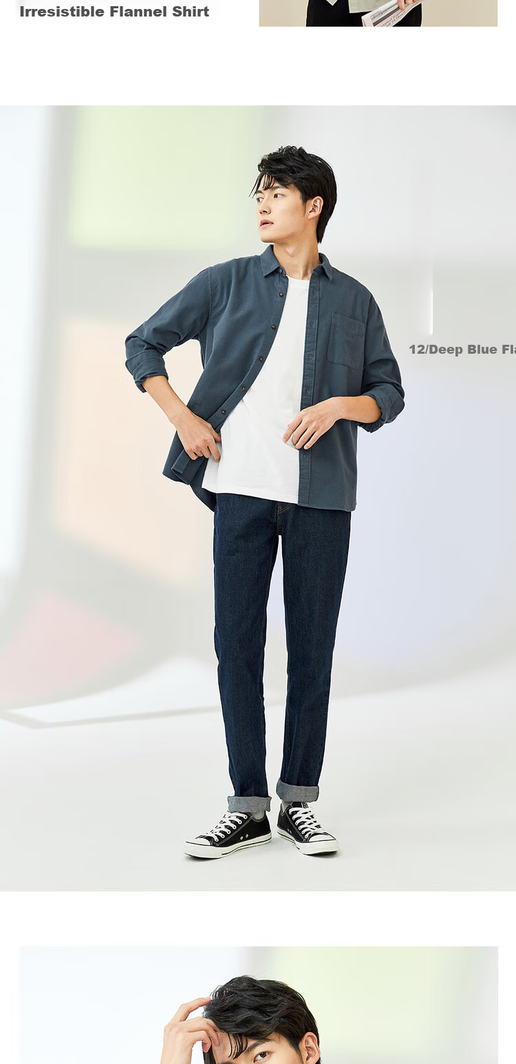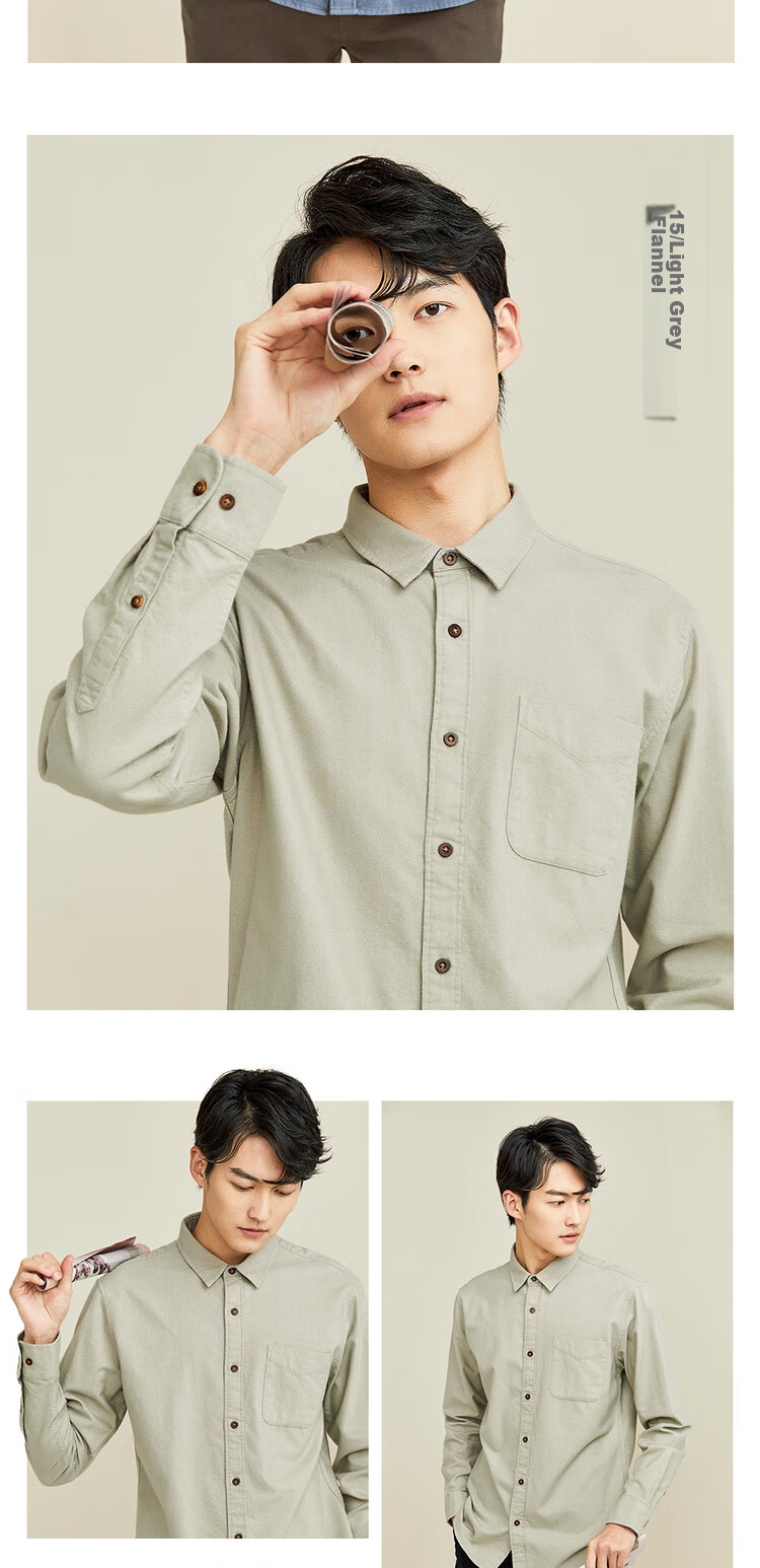 **Model Display:** Dark grey flannel, blue flannel, light grey flannel