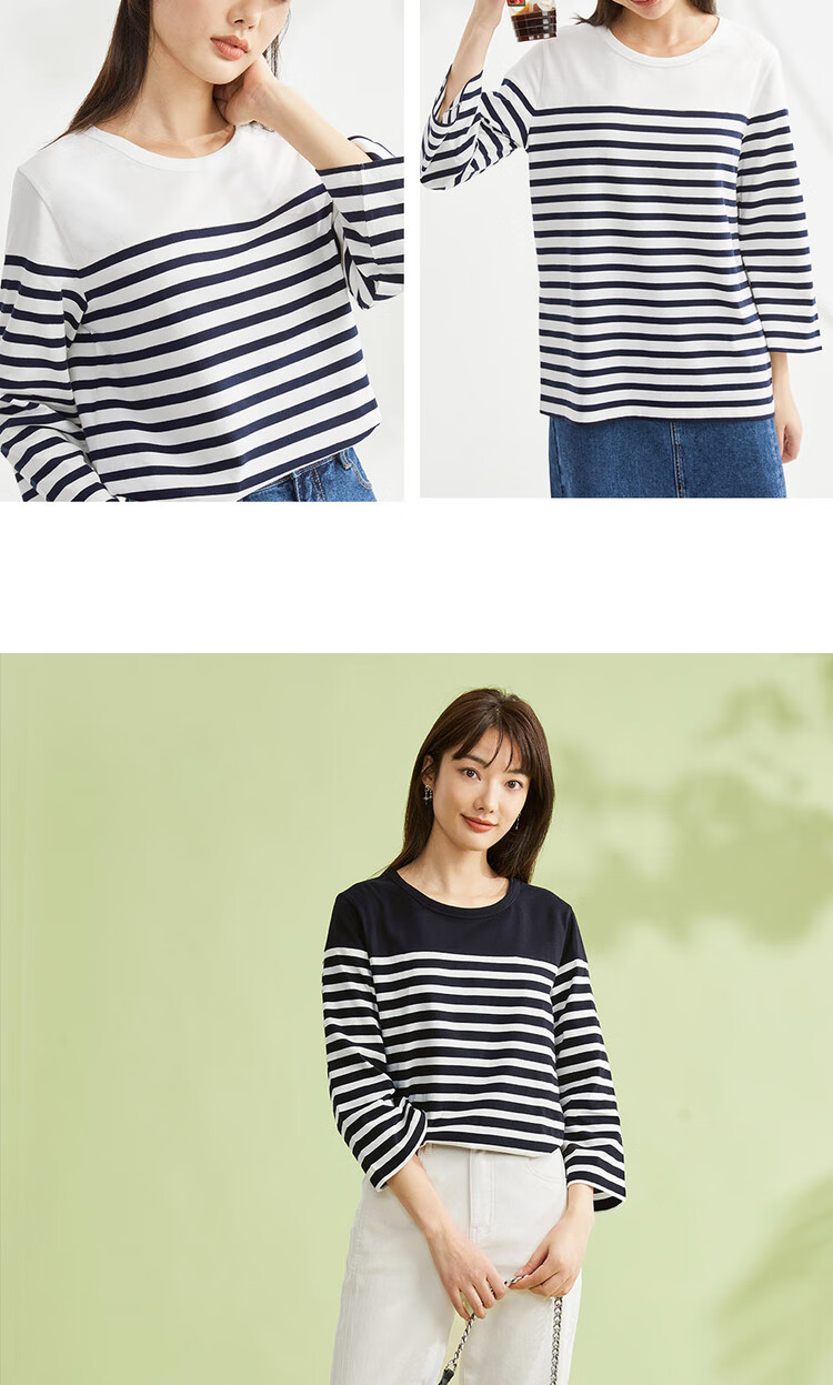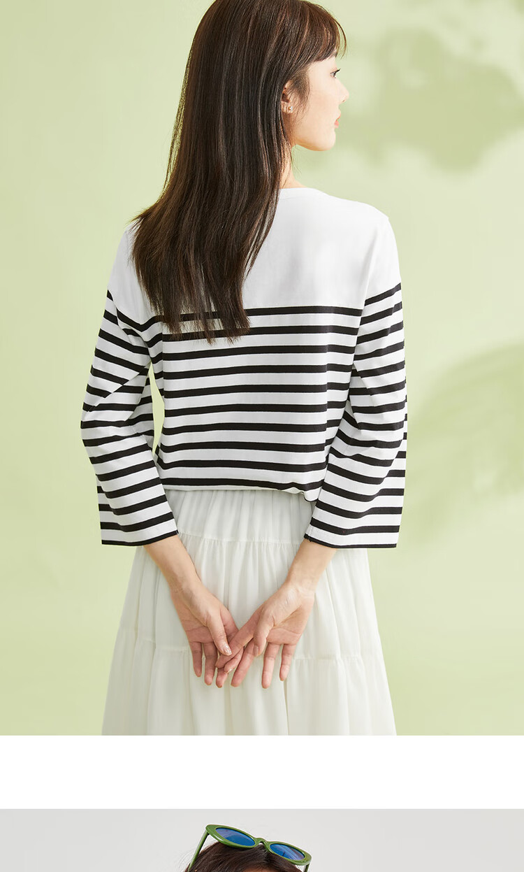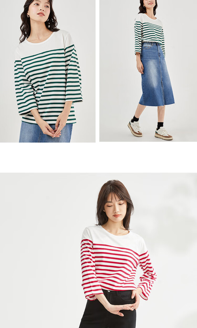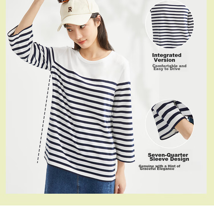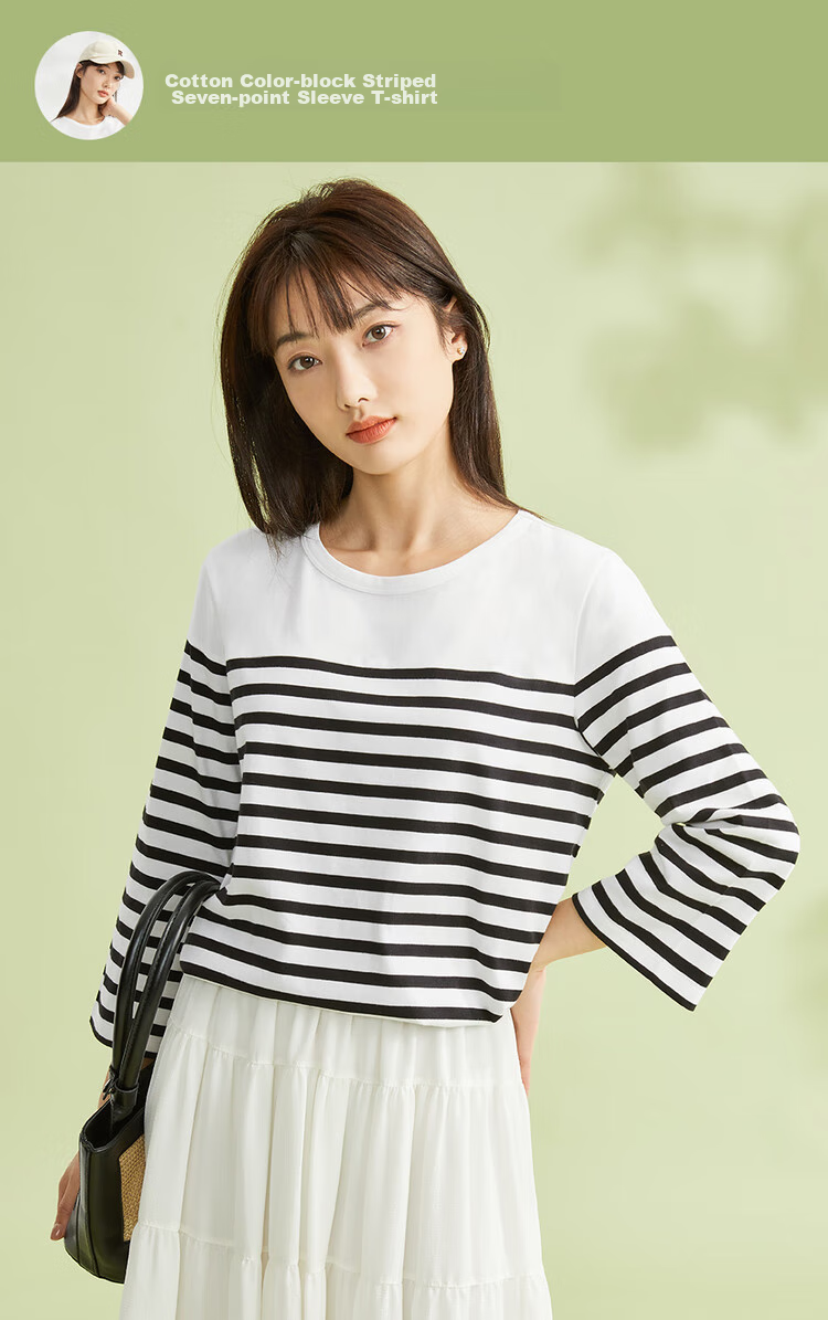 - Pure cotton contrast stripe seven-point sleeve T-shirt