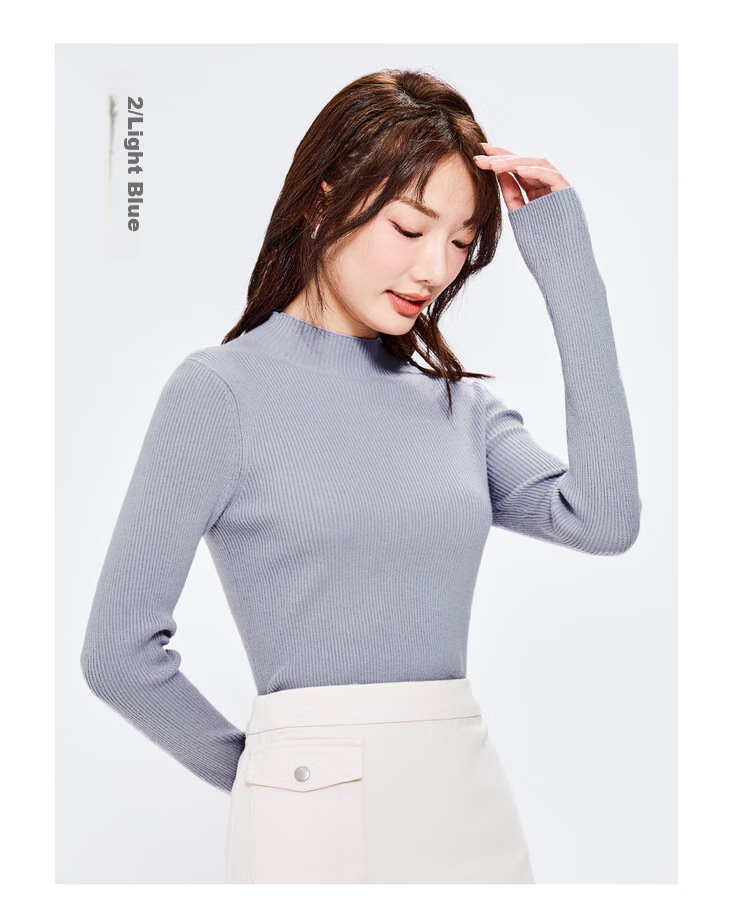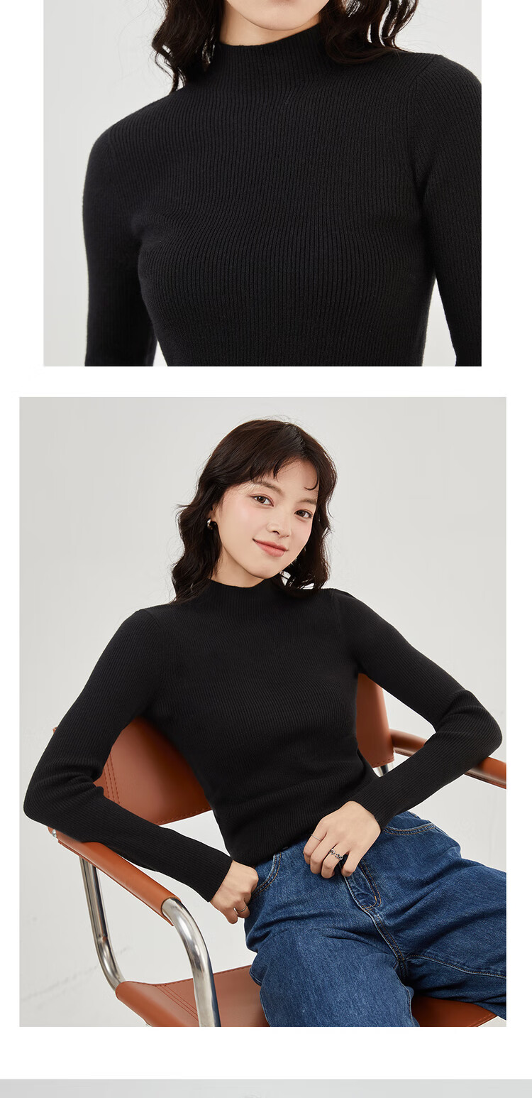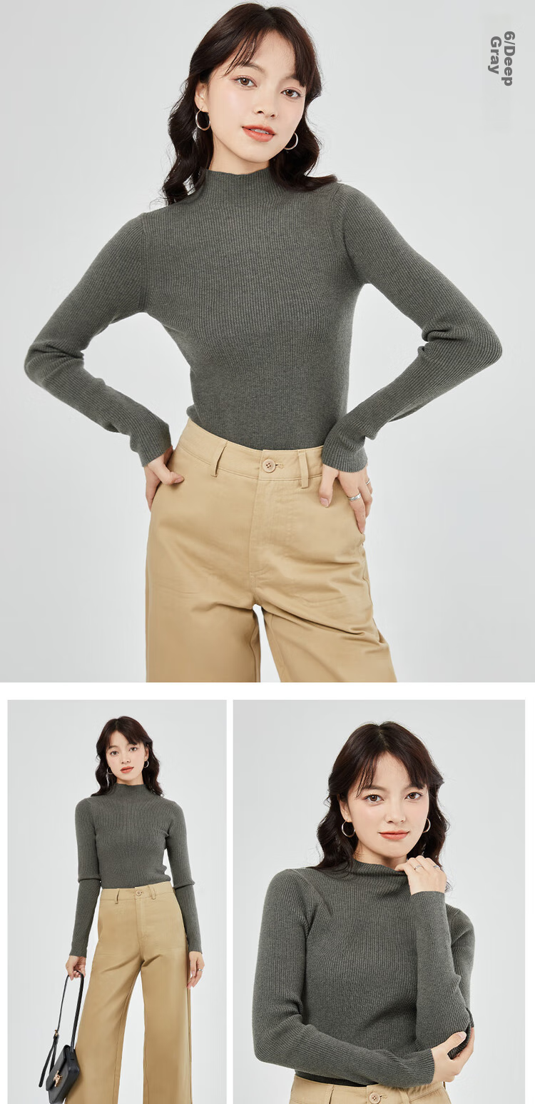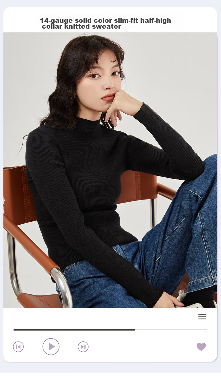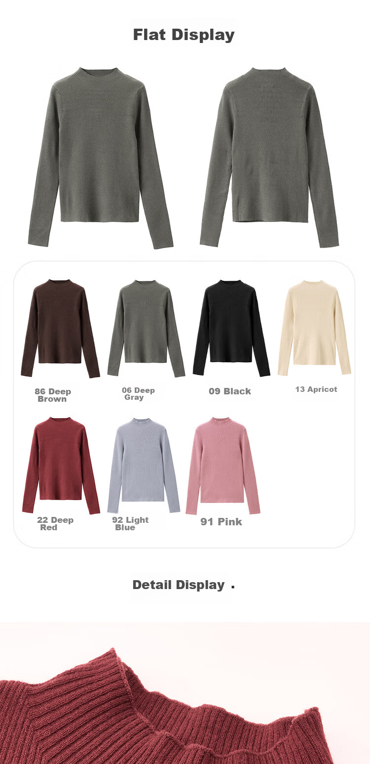 **Features:** 14-gauge solid color slim fit half-high collar knitted sweater