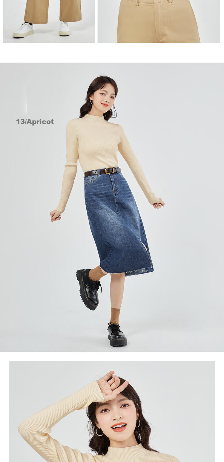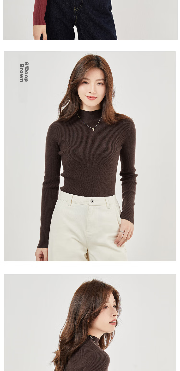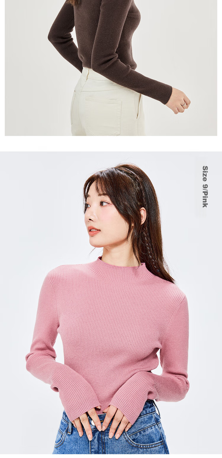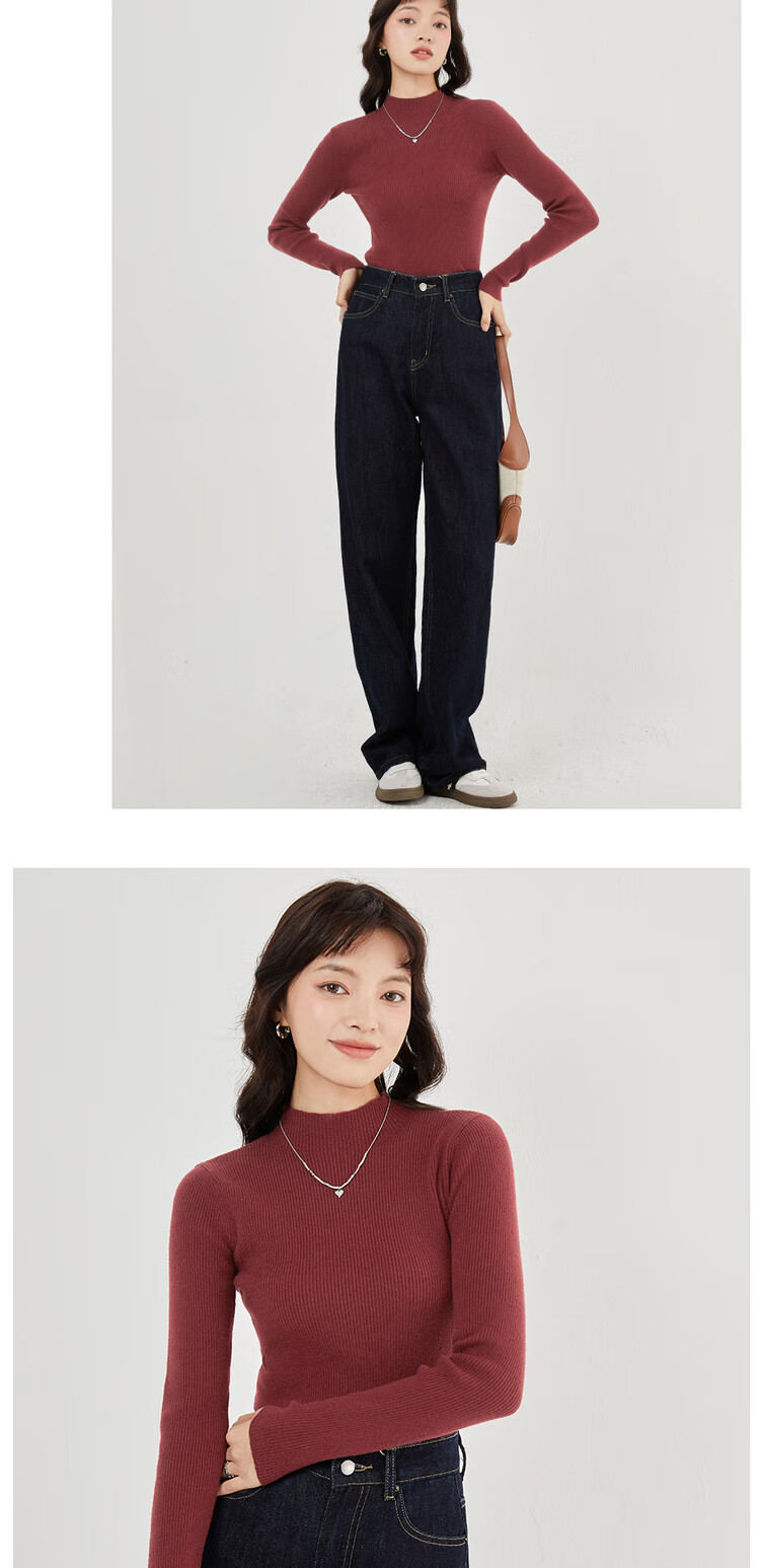**Features:** 14-gauge solid color slim fit half-high collar knitted sweater