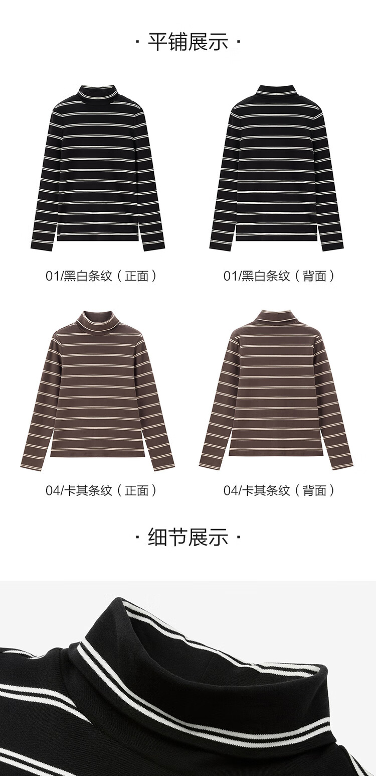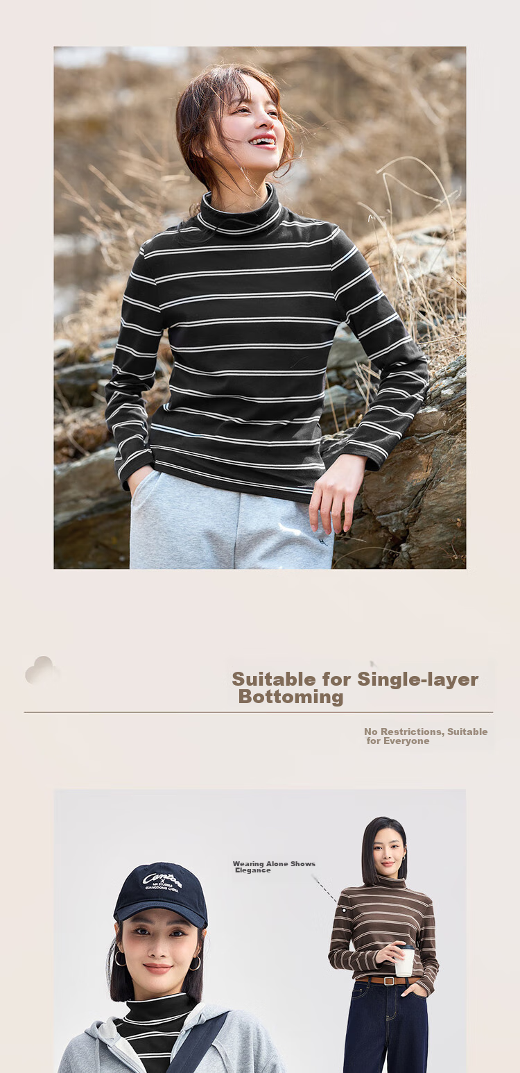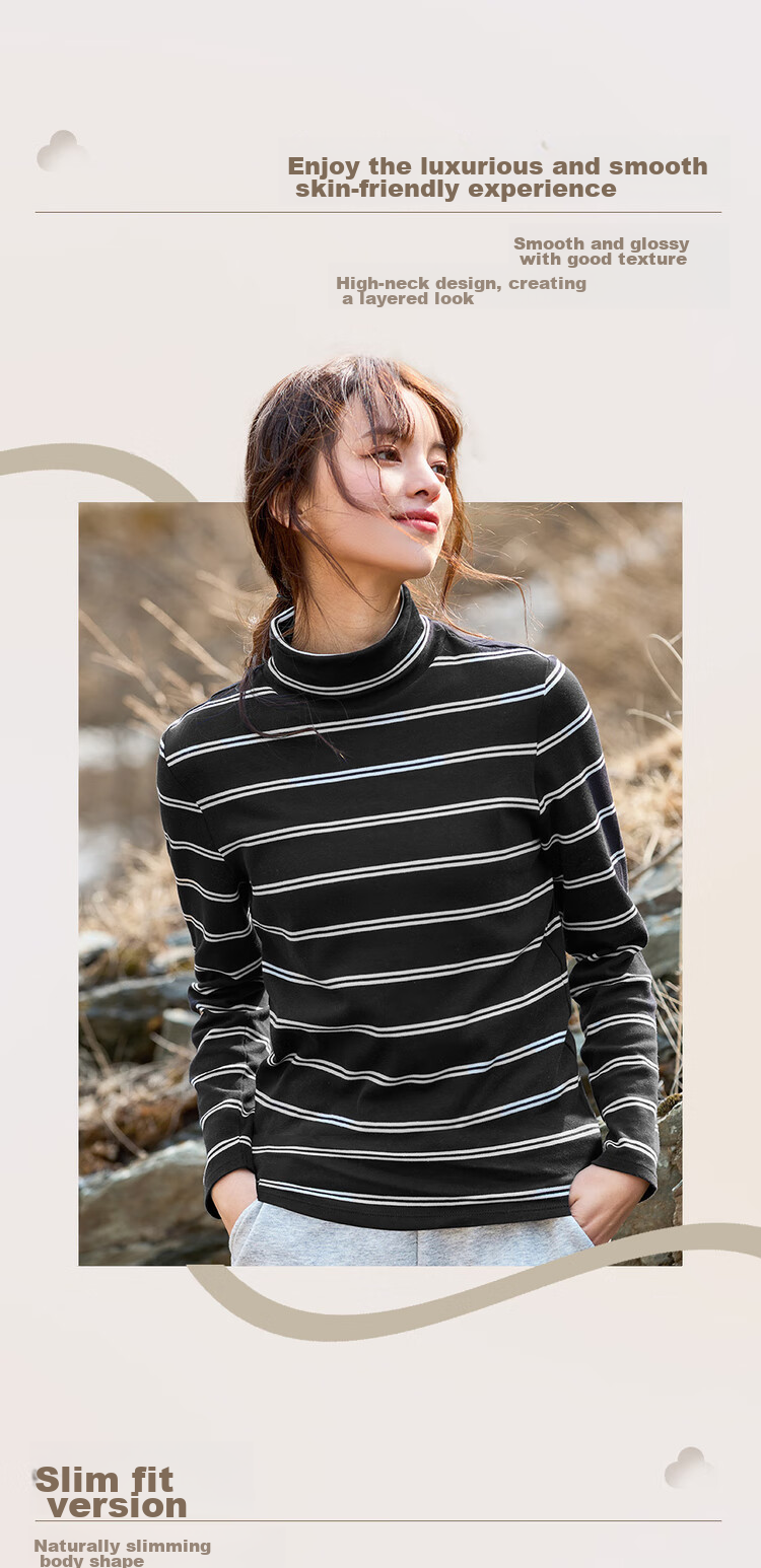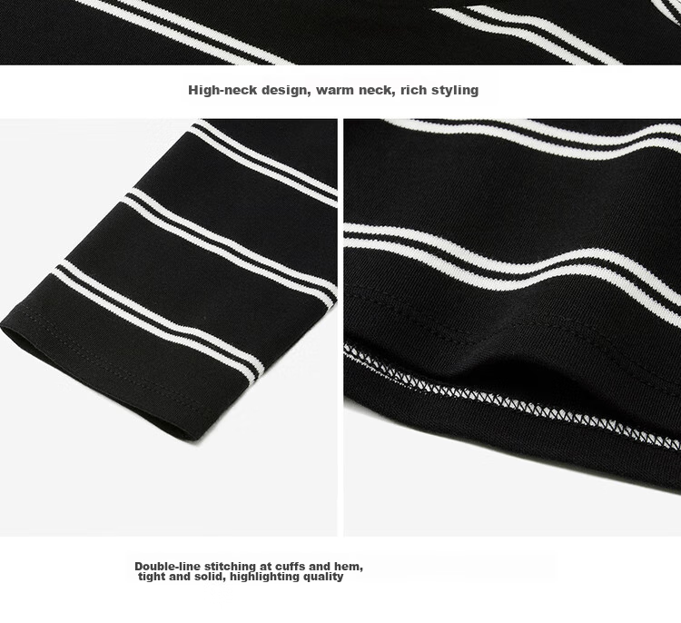 Features: Knitted striped high-neck T-shirt, suitable for layering or wearing alone, moderate thickness, soft and comfortable, slightly elastic