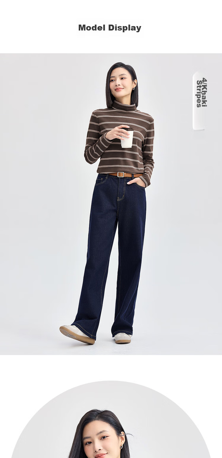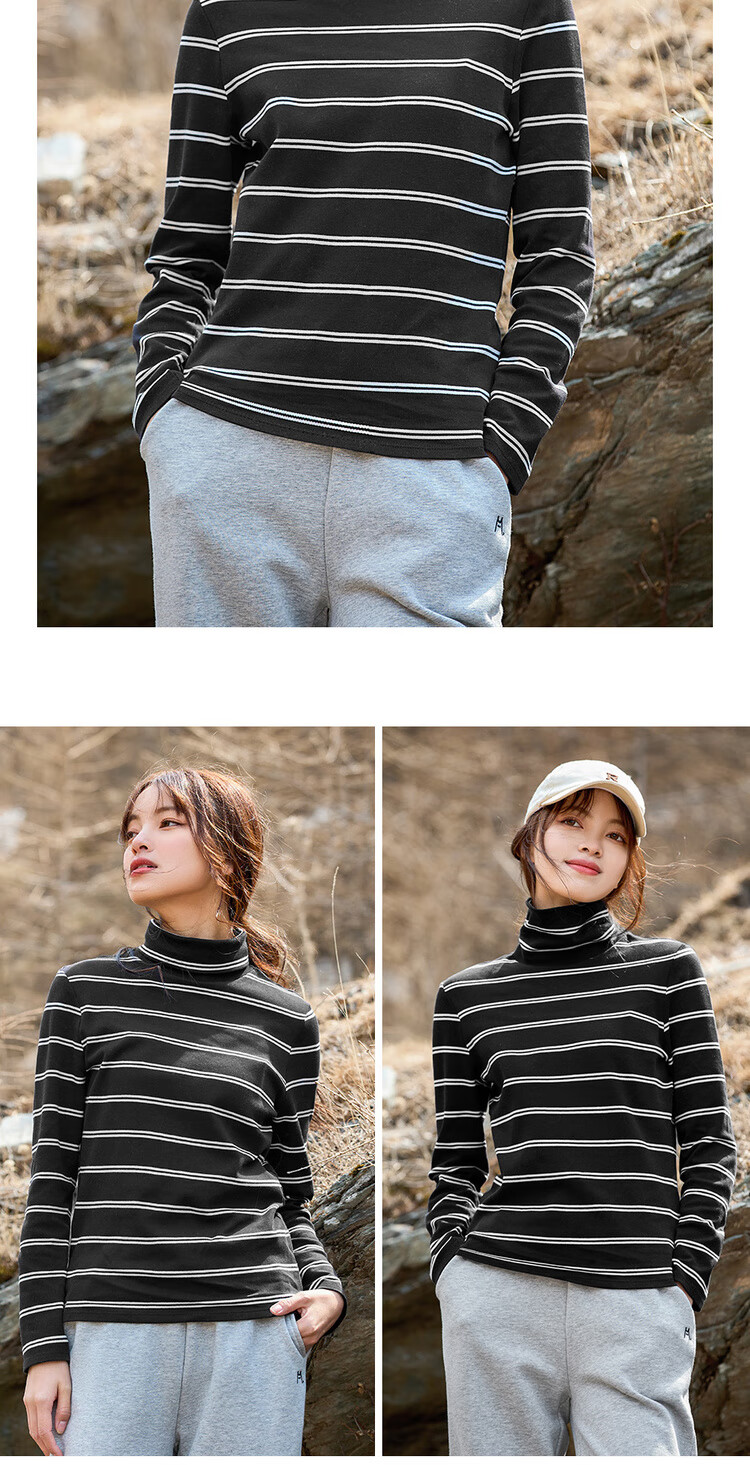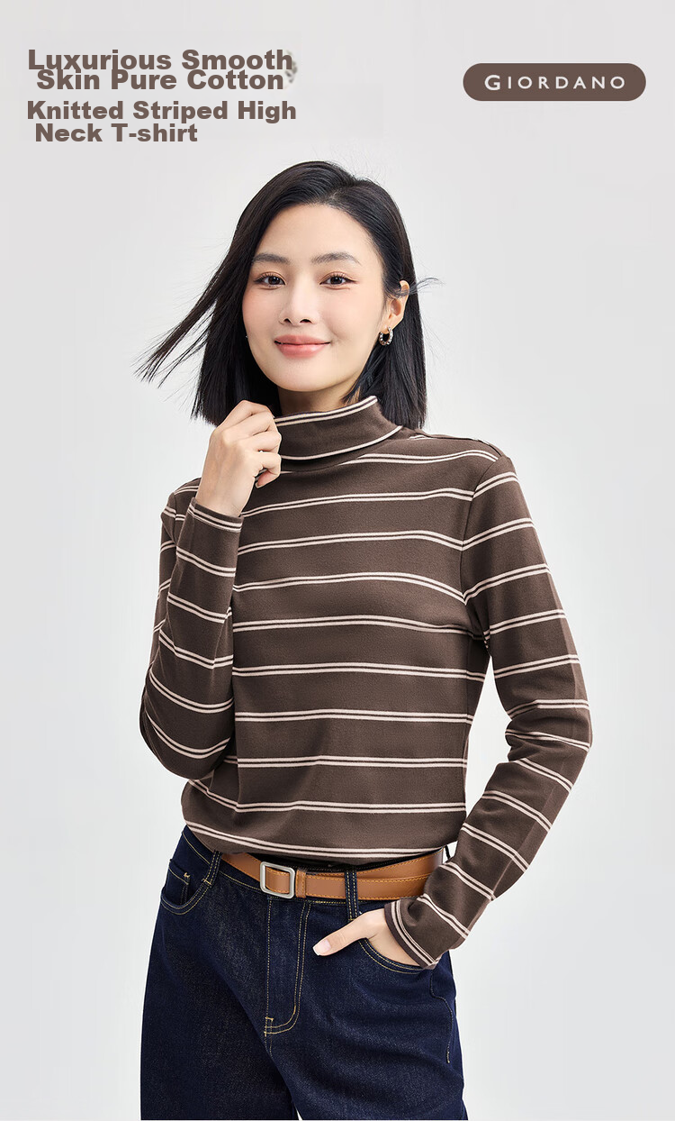 Features: Knitted striped high-neck T-shirt, suitable for layering or wearing alone, moderate thickness, soft and comfortable, slightly elastic