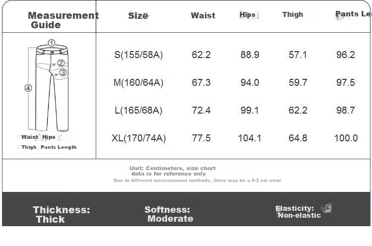 Inseam Measurements (cm): S - 96.2, M - 97.5, L - 98.7, XL - 100.0