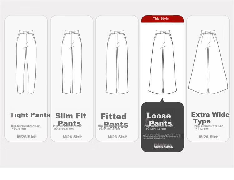 **Fit:** Slim fit, skinny pants, tailored pants, loose pants, wide-leg pants, super wide-leg