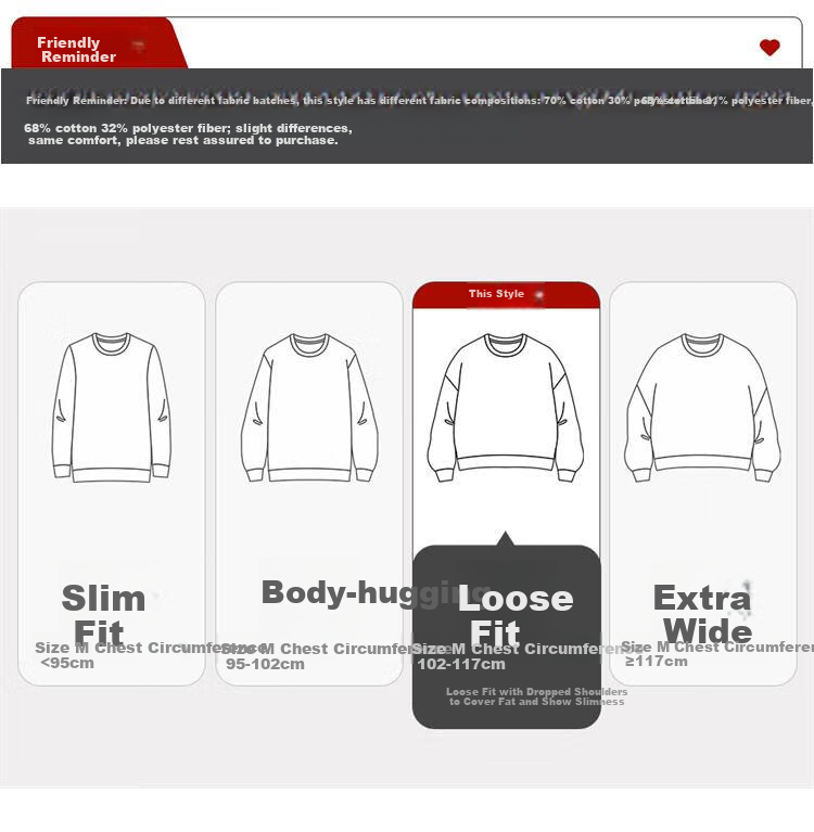 **Fit:** Slim fit, regular fit, loose fit, oversized fit. Shoulder width loose to cover flesh and appear slim.