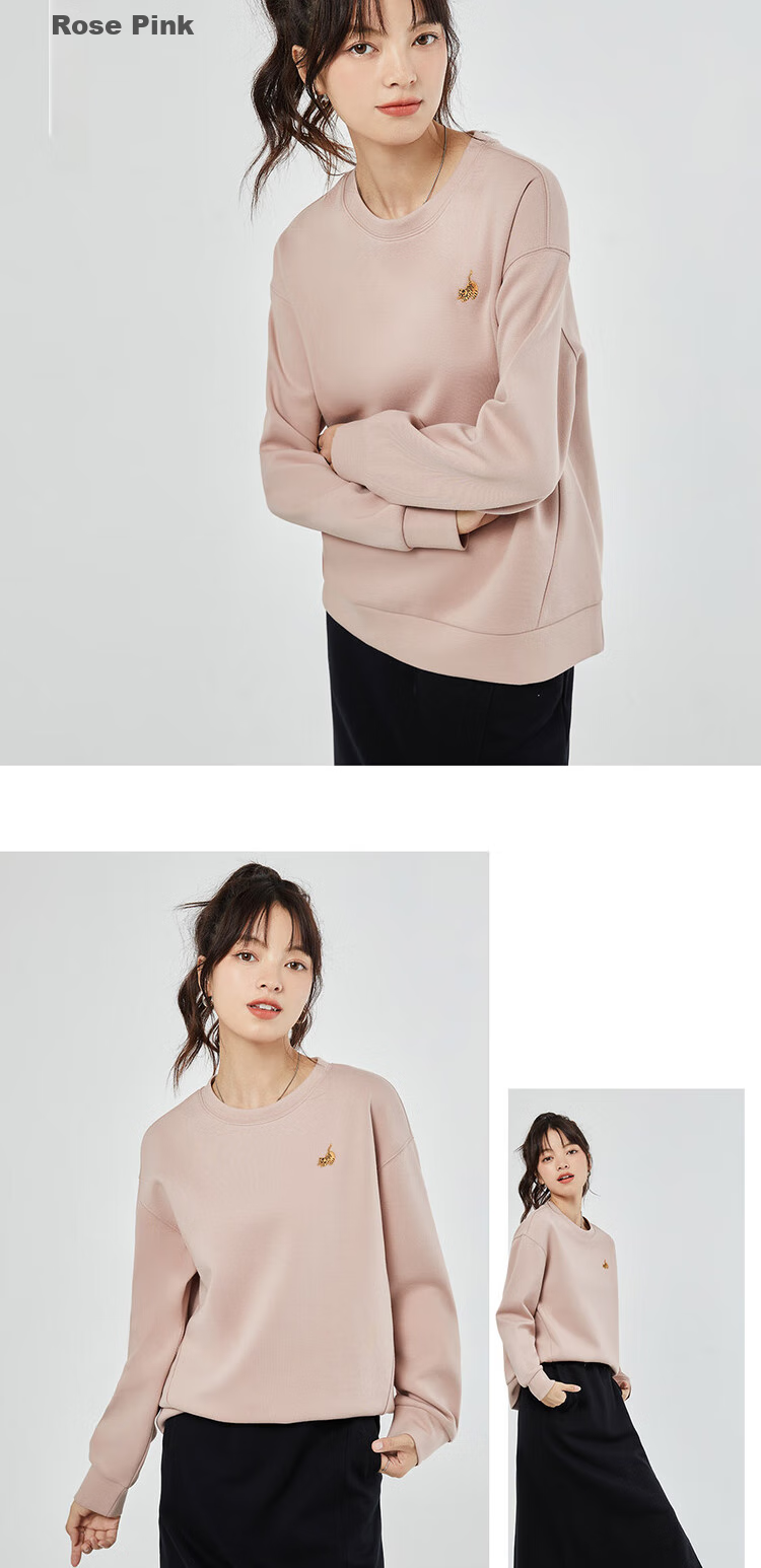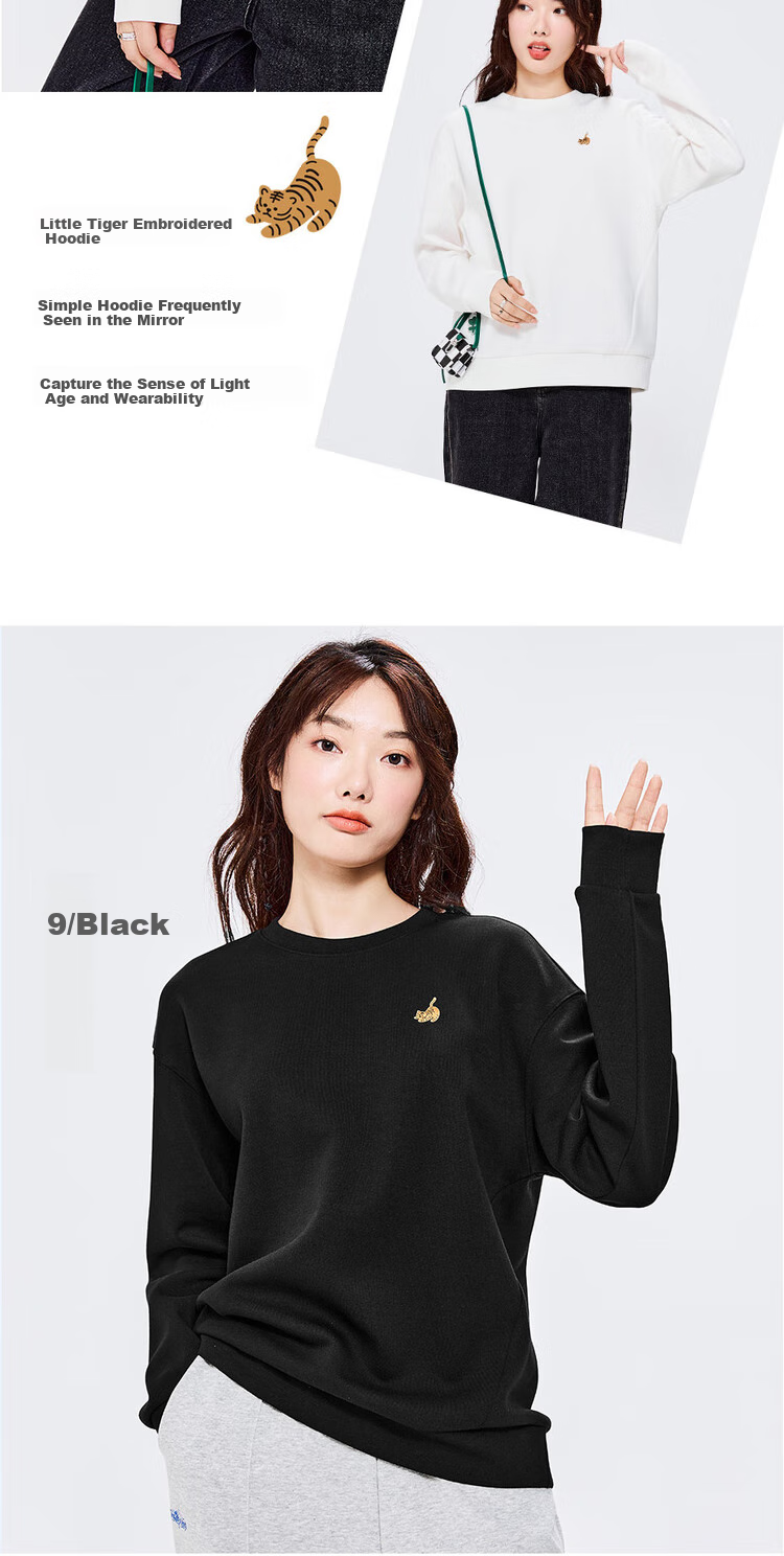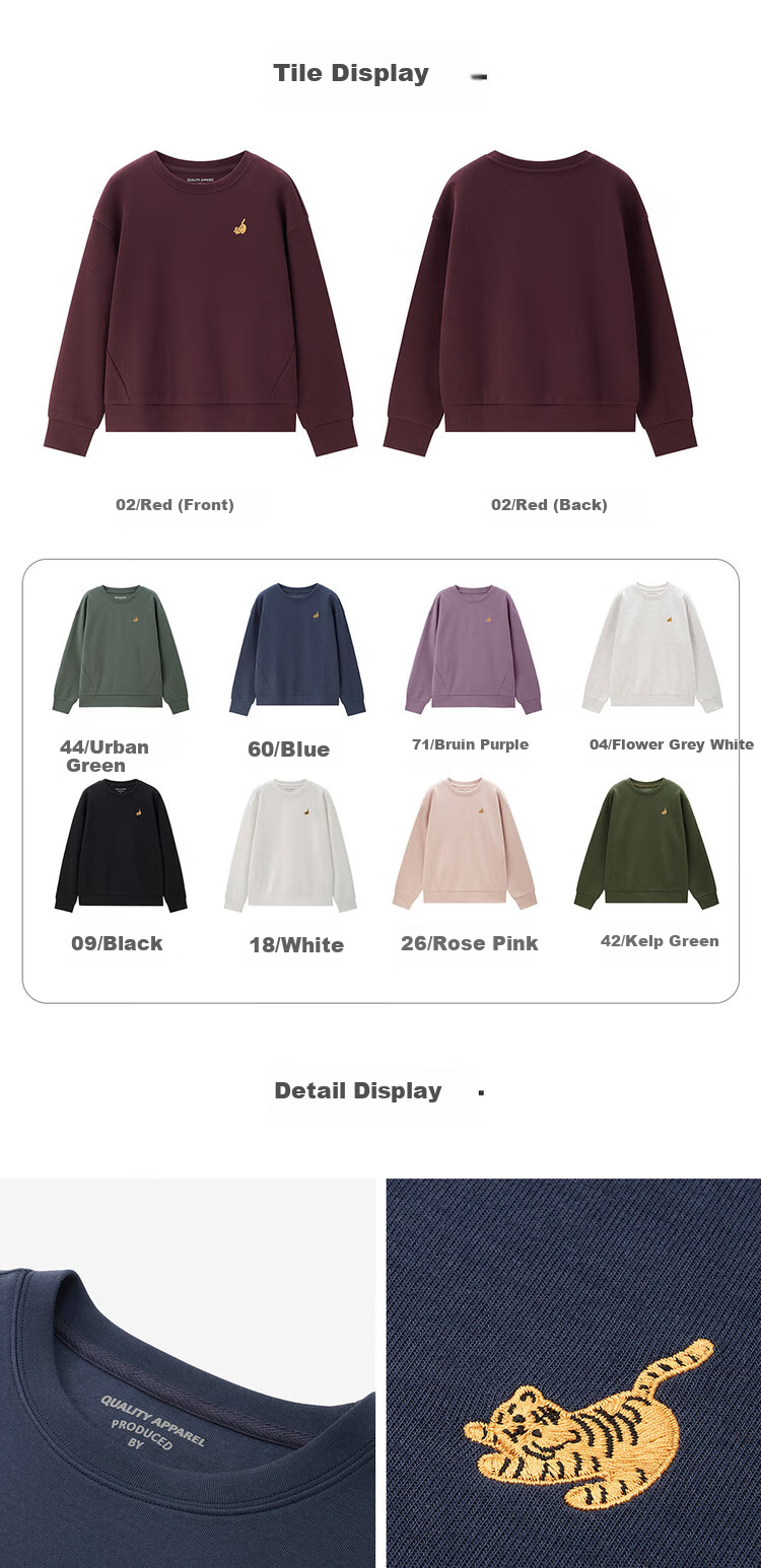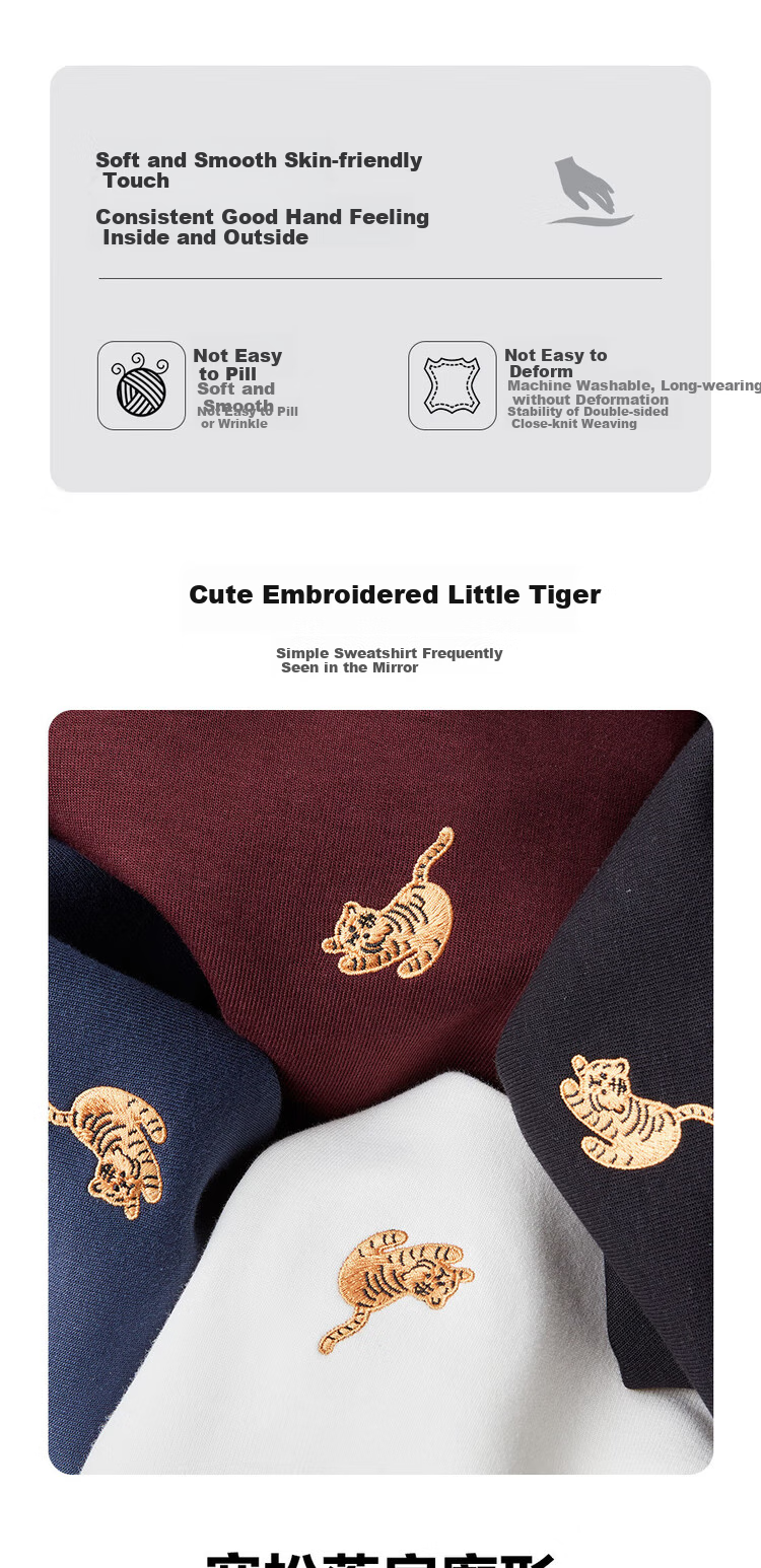 **Features:** Double-sided knitted fabric, loose fit sweatshirt with cute tiger embroidery. Smooth and skin-friendly touch, good hand feel inside and out, resistant to pilling and deformation. Soft and smooth, machine washable and durable, maintains shape and appearance. Stable double-sided weaving, featuring adorable tiger embroidery.
